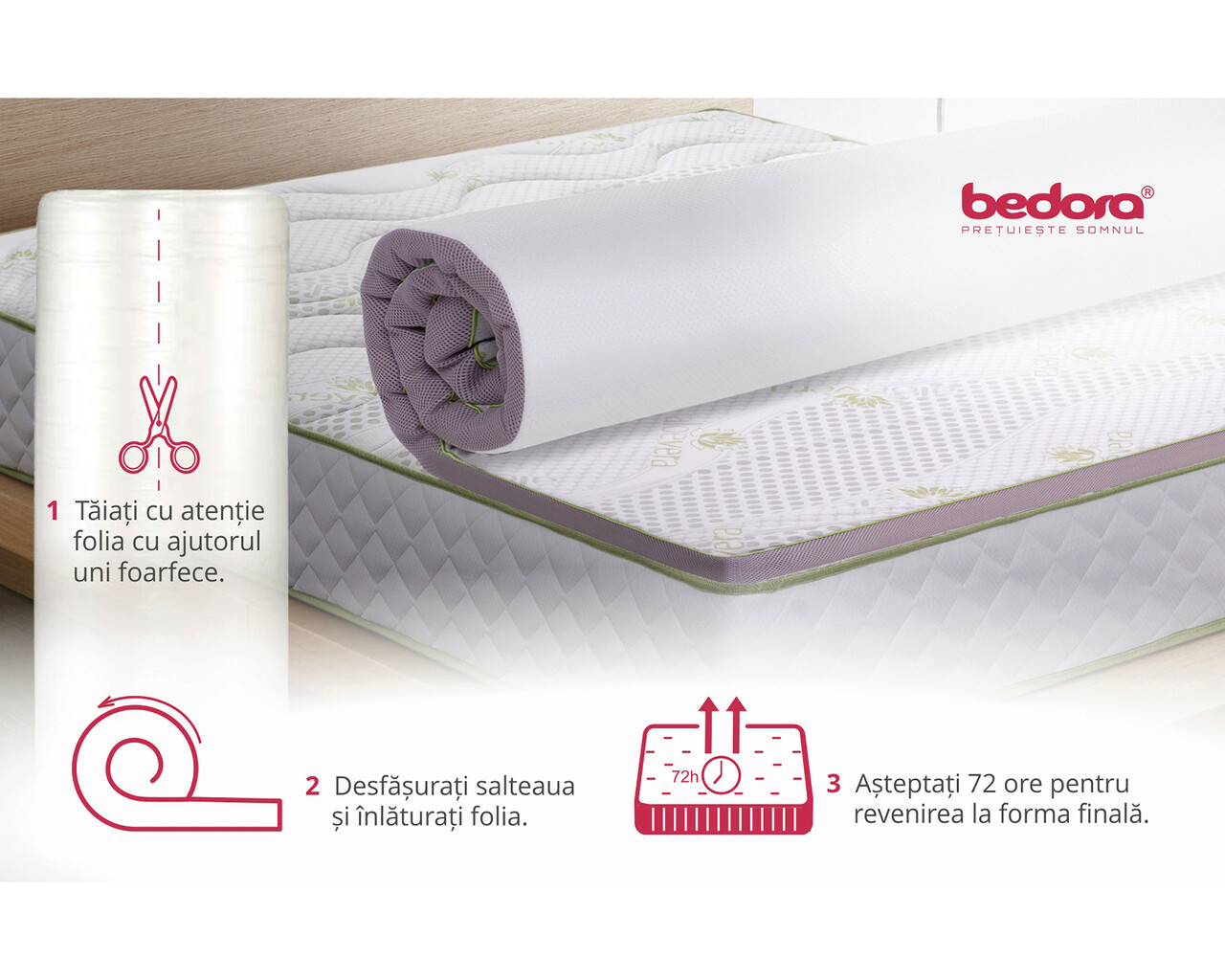 - desfaceti cu grija folia de protectie, fara a folosi cutitul sau alte obiecte taioase care ar putea deterioara tesatura topper-ului.