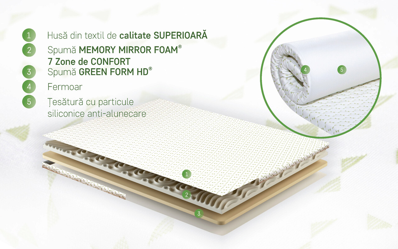 - spuma memory Mirror Foam profilata cu 7 zone de confort, H = 3 cm