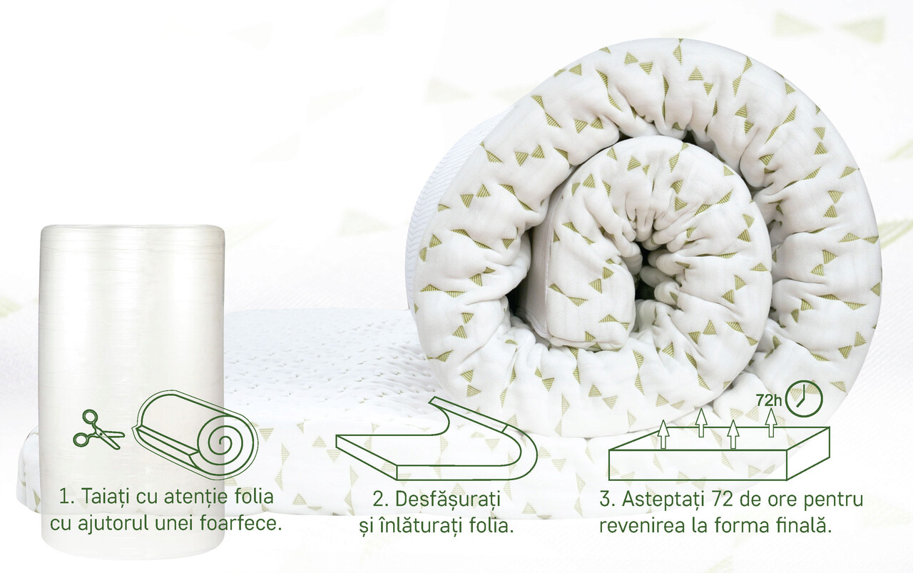 - desfaceti cu grija folia de protectie, fara a folosi cutitul sau alte obiecte taioase care ar putea deterioara tesatura topper-ului.