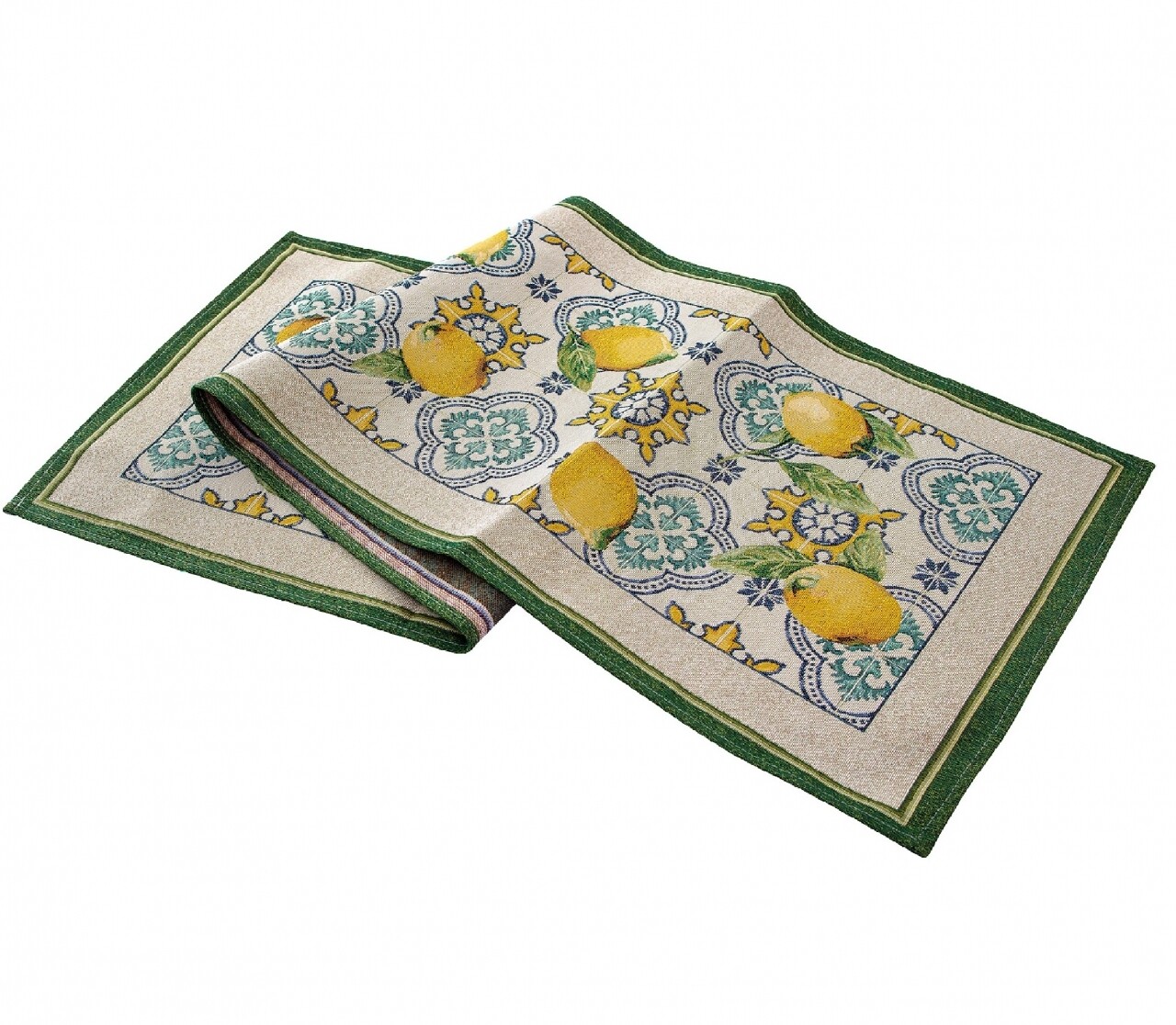 Traversa de masa Sorrento se remarca datorita imprimeului mediteranean, colorat, ce te duce cu gandul la vacante petrecute in Portugalia. Imprimeul imita modelul placilor ceramice specifice portughezilor iar lamaile dau o pata de culoare.