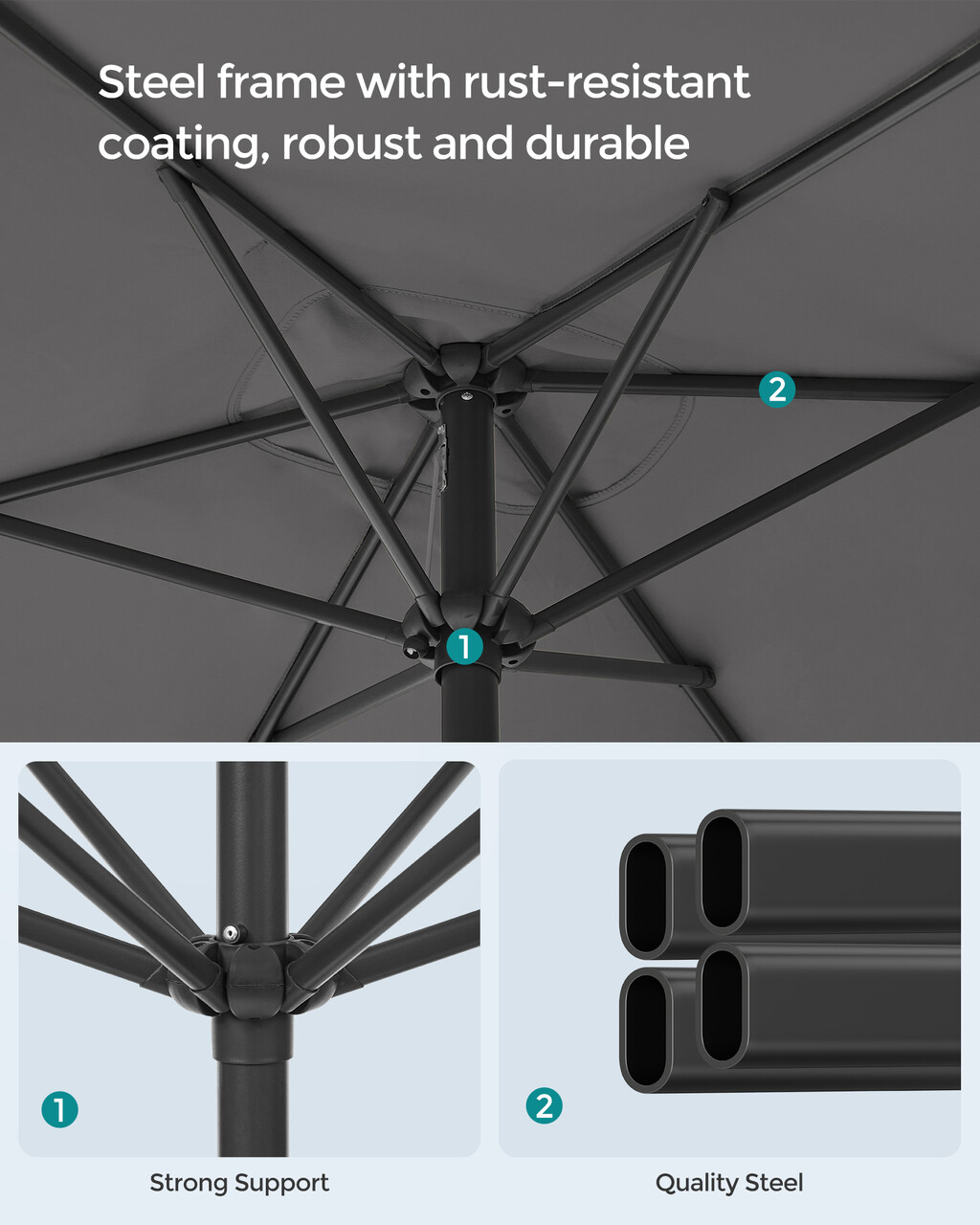 Structura rezistenta si durabila: Datorita celor 6 spite si stalpului din otel rezistent cu acoperire protectoare, aceasta umbrela de gradina are o structura robusta si o durata lunga de utilizare.