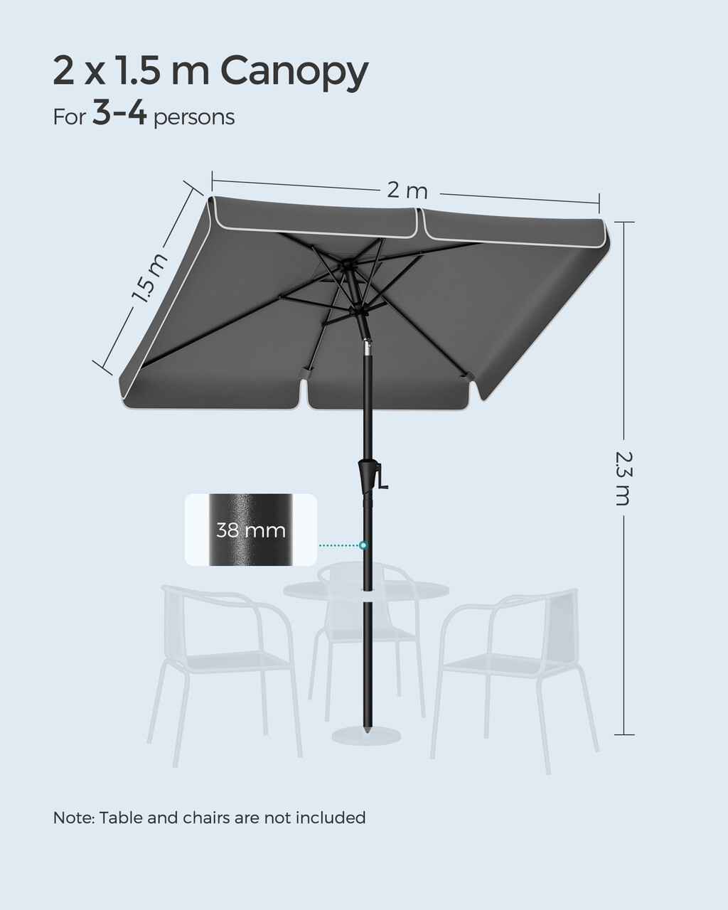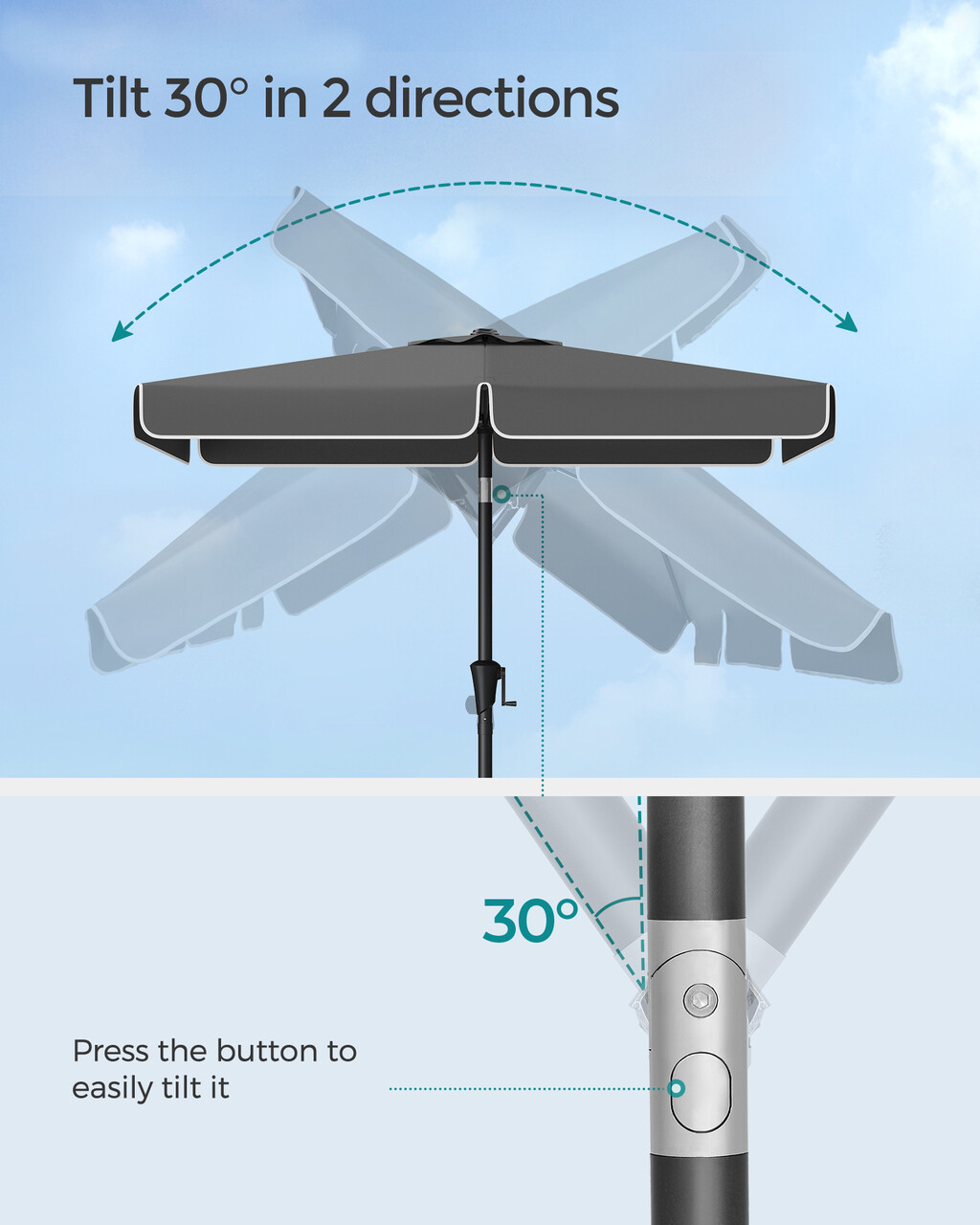Umbrela dreptunghiulara pentru gradina, tesara si balcon, Songmics, 200 x 125, protectie UV 50+, inclinare 30 grade in doua directii, gri