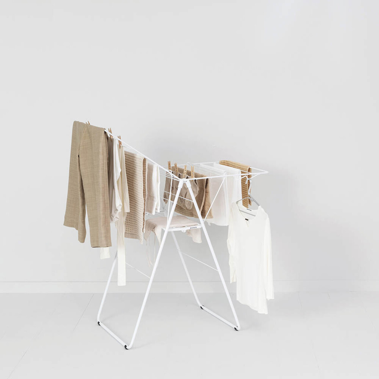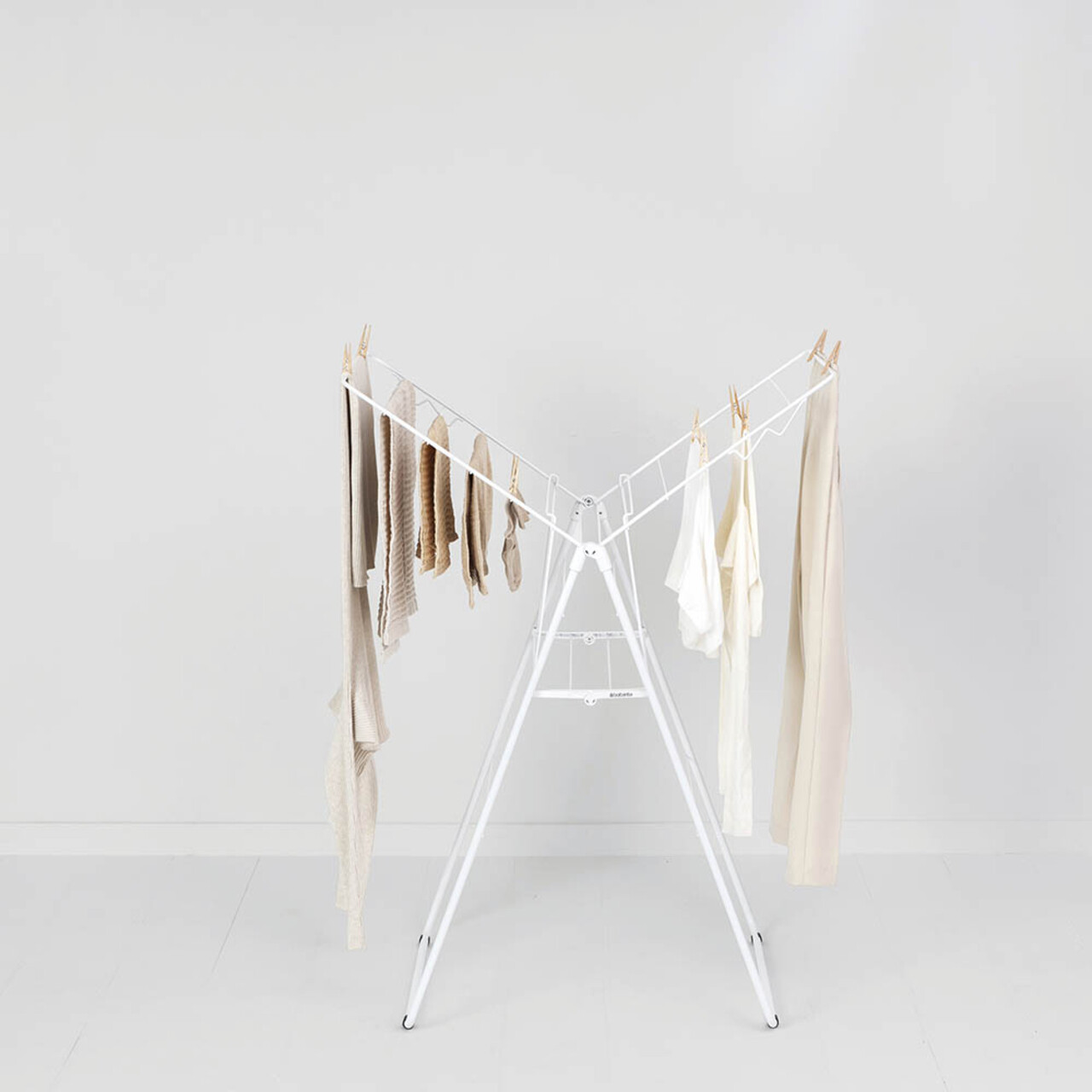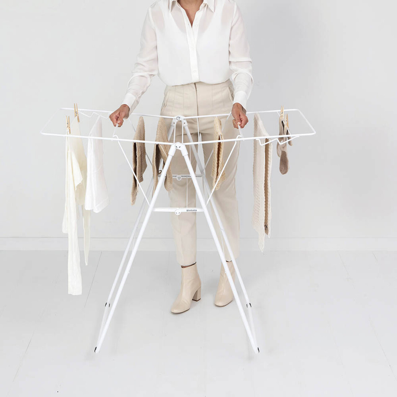 Uscatorul de rufe Brabantia HangOn ofera 15 metri de spatiu flexibil pentru uscare si loc pentru 4 umerase suplimentare – perfect pentru pantaloni atarnati sau haine delicate intinse la uscat. Dupa utilizare, il pliezi rapid si il depozitezi cu usurinta. Mult spatiu de uscare, chiar si in cele mai mici locuinte!