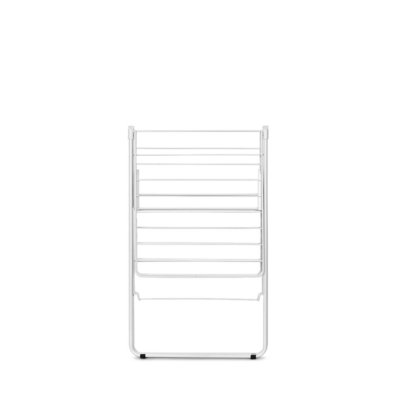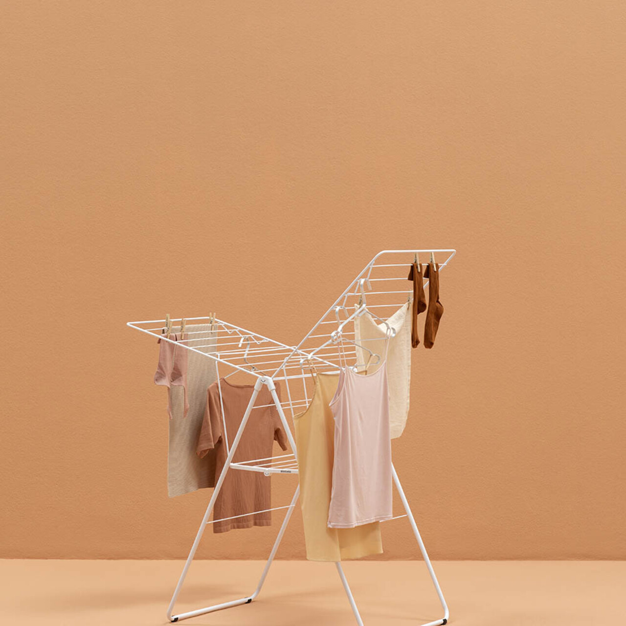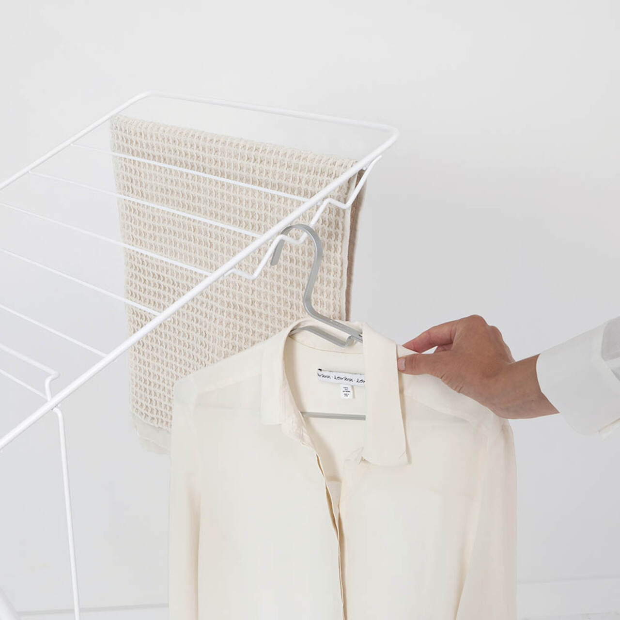 Cu uscatorul de rufe Brabantia HangOn, care ofera 20 de metri de spatiu flexibil pentru uscare si loc pentru 6 umerase suplimentare, poti usca pantalonii pe verticala sau hainele delicate pe orizontala, oriunde in casa. Dupa utilizare, il pliezi rapid si il depozitezi cu usurinta. Un suport de uscare excelent!
