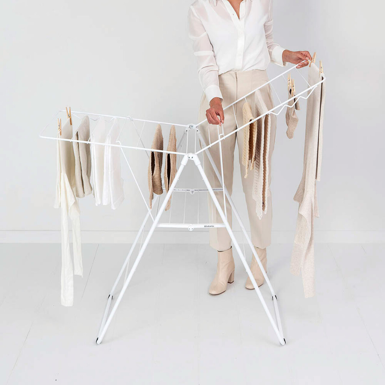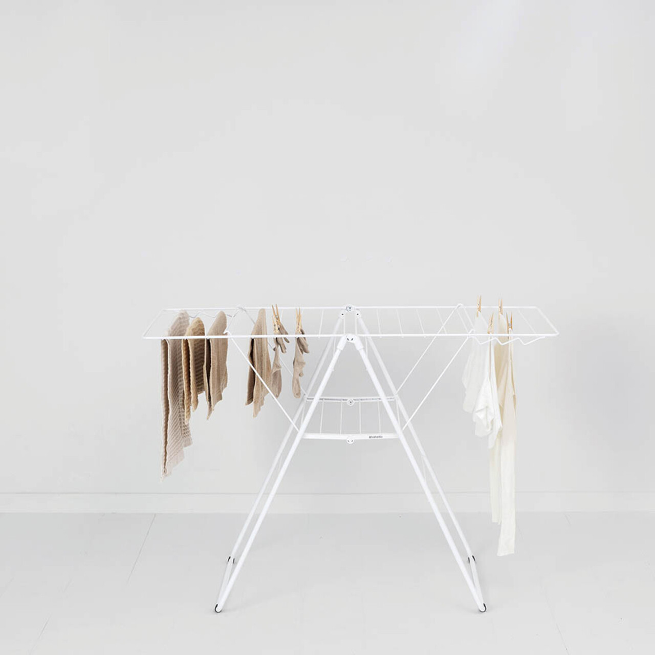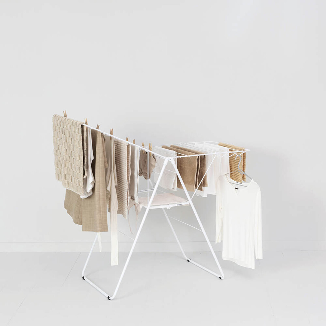 Cu uscatorul de rufe Brabantia HangOn, care ofera 20 de metri de spatiu flexibil pentru uscare si loc pentru 6 umerase suplimentare, poti usca pantalonii pe verticala sau hainele delicate pe orizontala, oriunde in casa. Dupa utilizare, il pliezi rapid si il depozitezi cu usurinta. Un suport de uscare excelent!