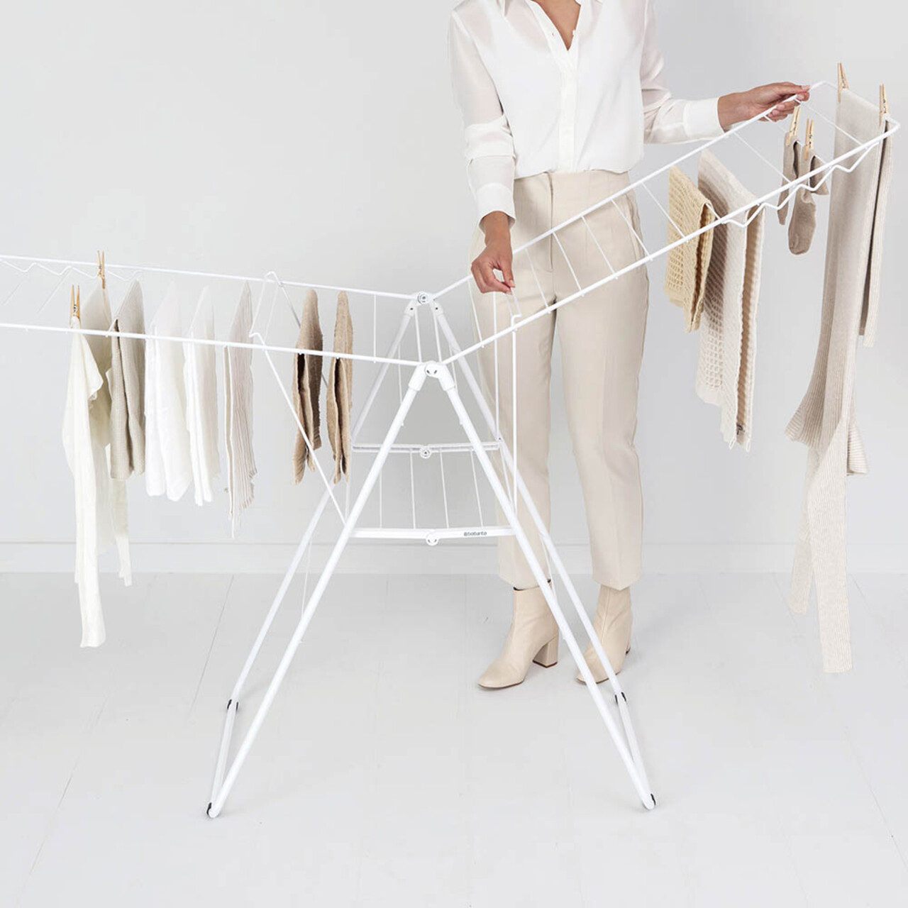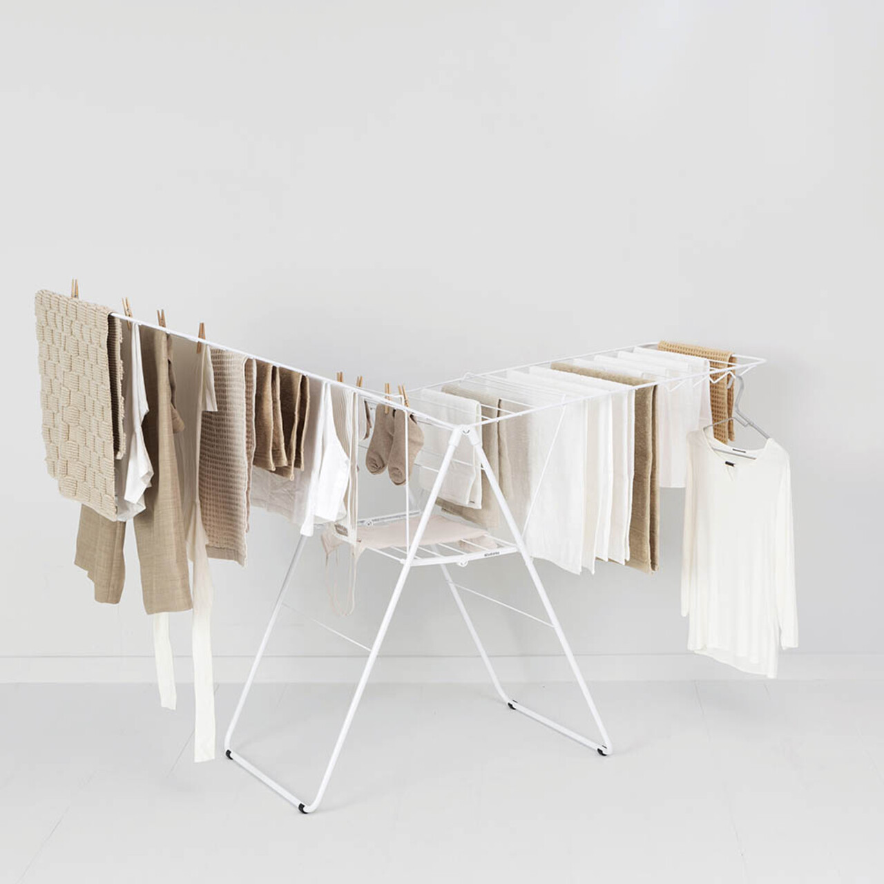 Cu uscatorul de rufe Brabantia HangOn, care ofera 25 de metri de spatiu flexibil pentru uscare si loc pentru 6 umerase suplimentare, poti usca pantalonii pe verticala sau hainele delicate pe orizontala, oriunde in casa. Dupa utilizare, il pliezi rapid si il depozitezi cu usurinta. Un suport de uscare excelent!