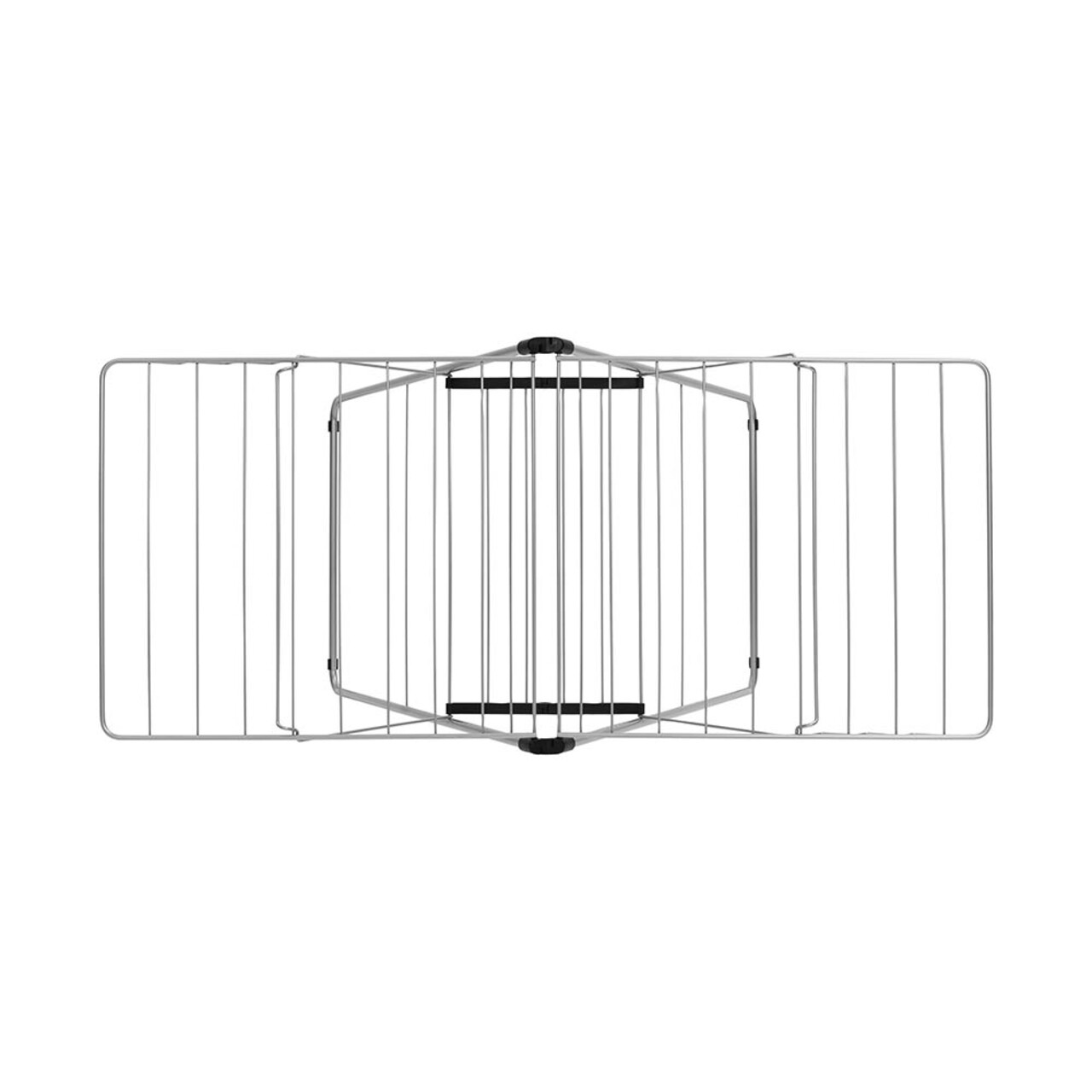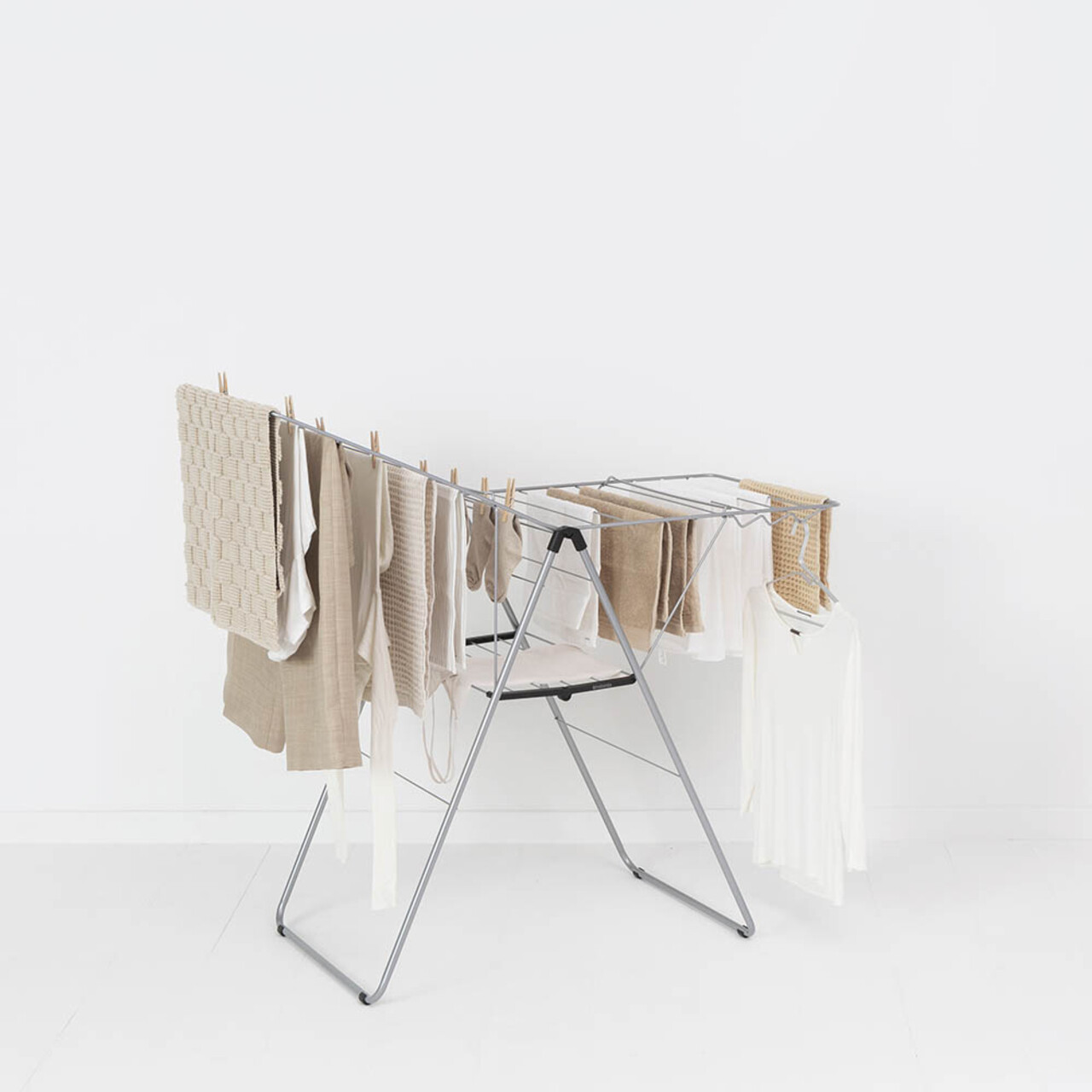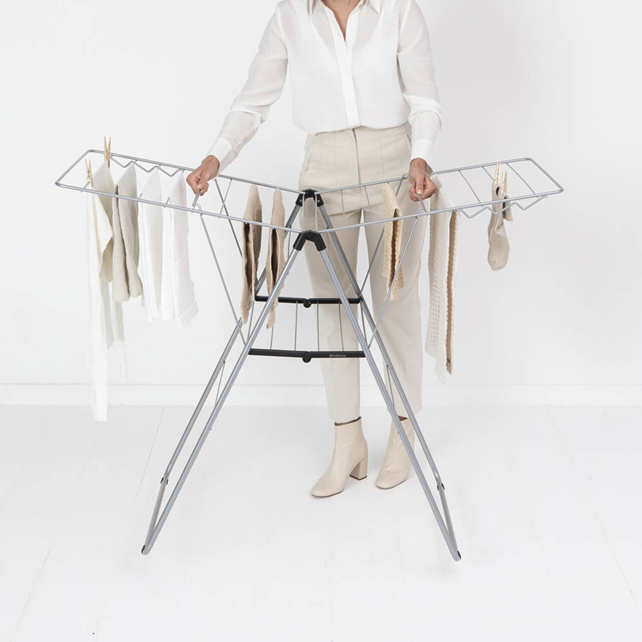 Cu uscatorul de rufe Brabantia HangOn, care ofera 20 de metri de spatiu flexibil pentru uscare si loc pentru 6 umerase suplimentare, poti usca pantalonii pe verticala sau hainele delicate pe orizontala, oriunde in casa. Dupa utilizare, il pliezi rapid si il depozitezi cu usurinta. Un suport de uscare excelent!