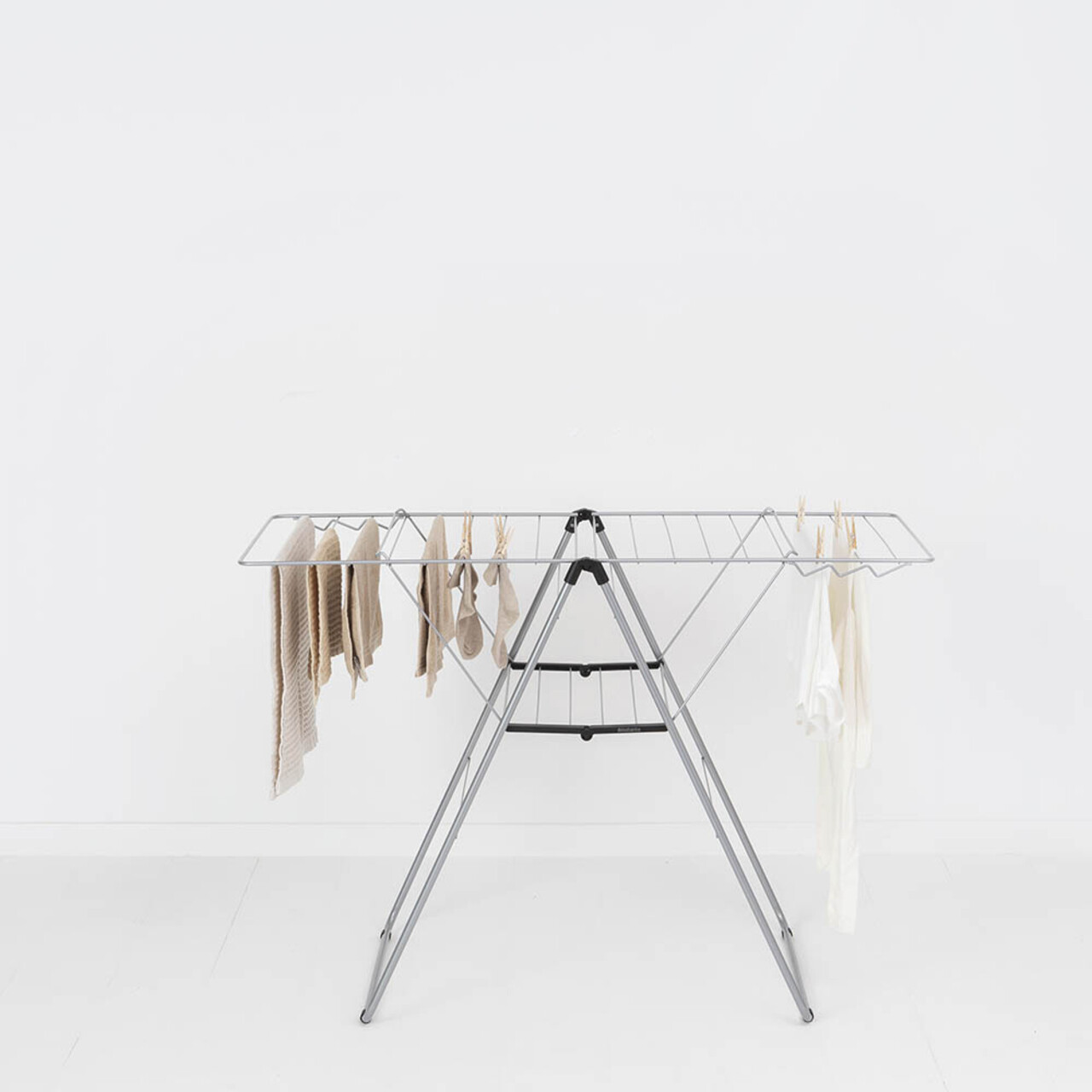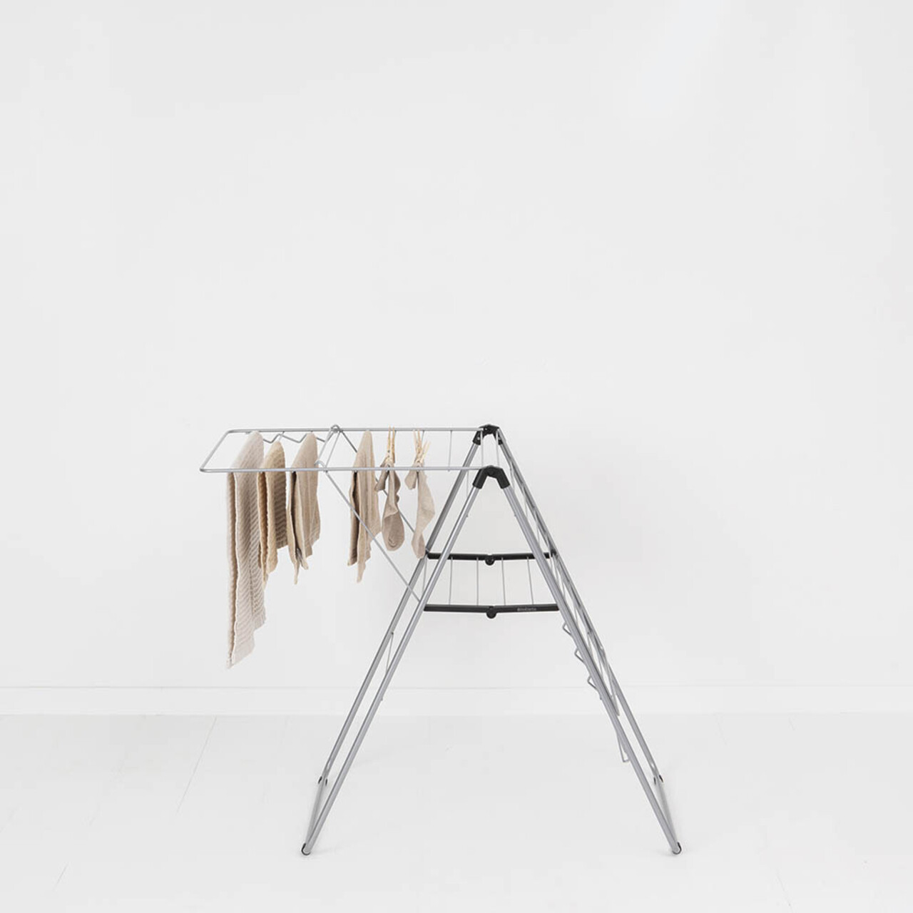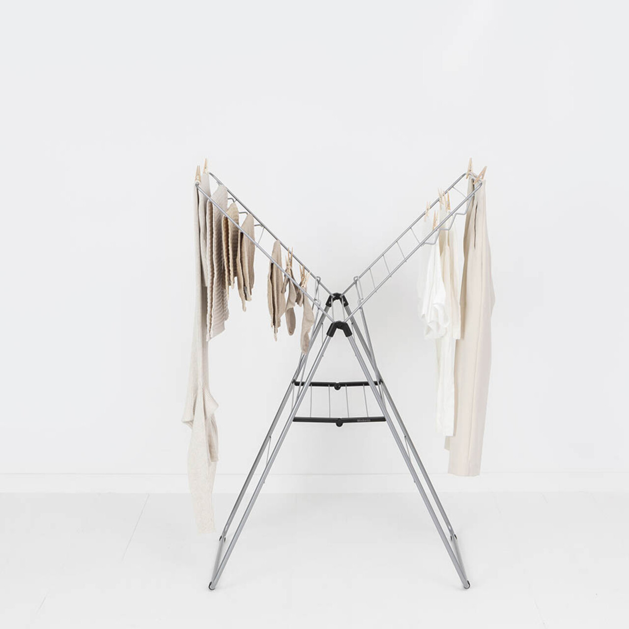 Cu uscatorul de rufe Brabantia HangOn, care ofera 20 de metri de spatiu flexibil pentru uscare si loc pentru 6 umerase suplimentare, poti usca pantalonii pe verticala sau hainele delicate pe orizontala, oriunde in casa. Dupa utilizare, il pliezi rapid si il depozitezi cu usurinta. Un suport de uscare excelent!