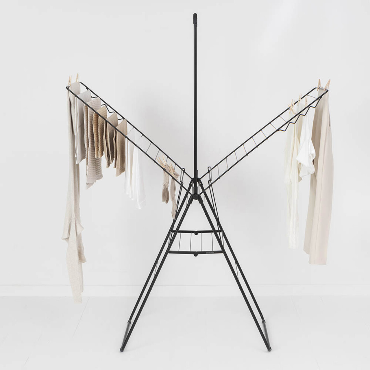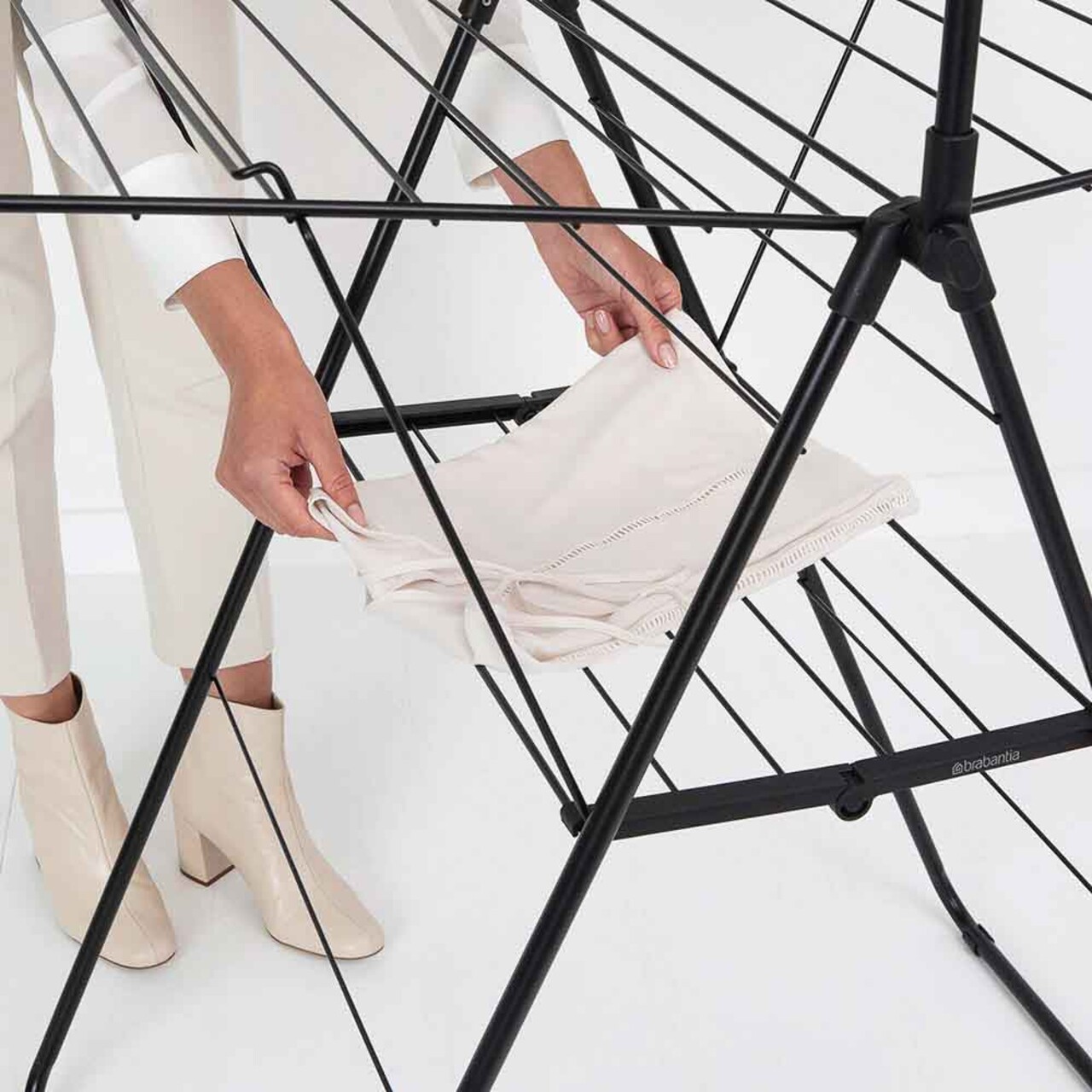 Cu uscatorul de rufe Brabantia HangOn, care ofera 25 de metri de spatiu flexibil pentru uscare si loc pentru 6 umerase suplimentare, poti usca pantalonii pe verticala sau hainele delicate pe orizontala, oriunde in casa. Dupa utilizare, il pliezi rapid si il depozitezi cu usurinta. Un suport de uscare excelent!