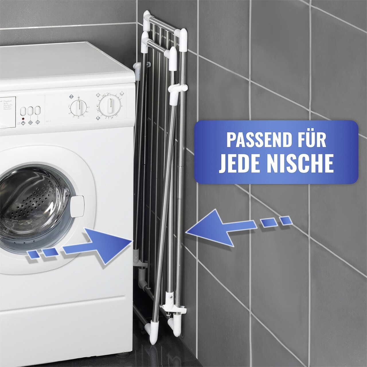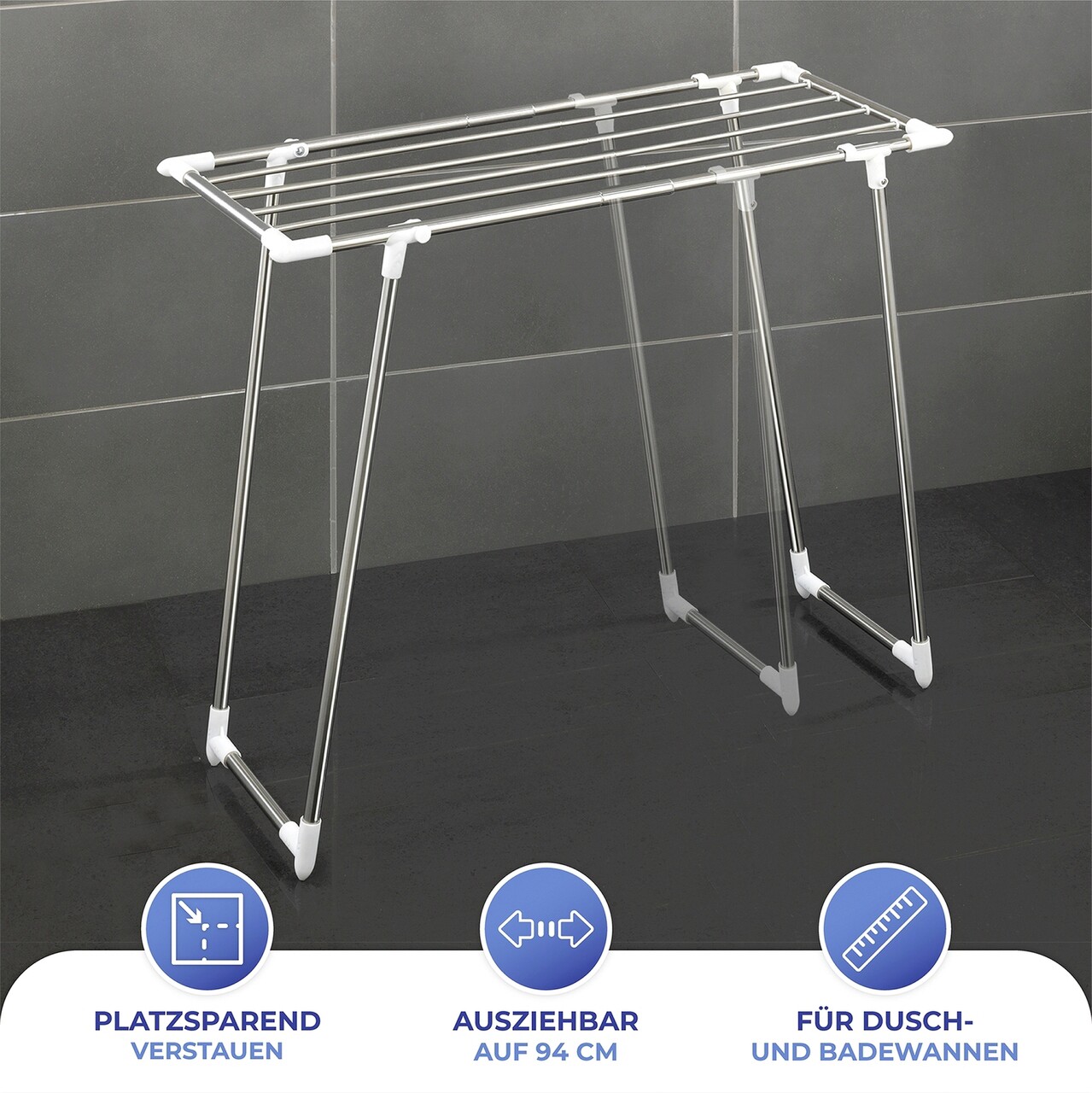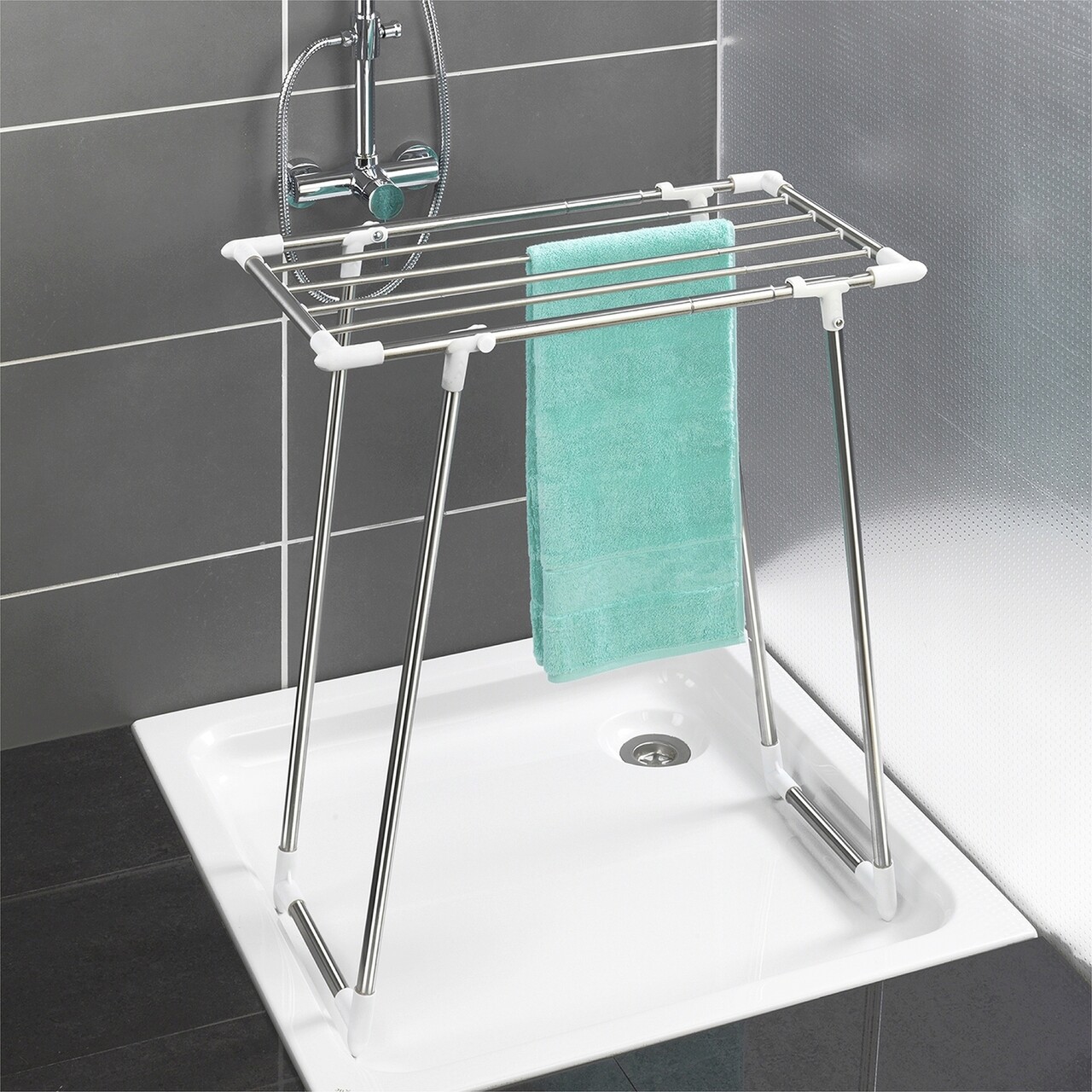 Uscatorul de rufe este ideal deoarece poate fi folosit in cada sau in dus. Este perfect pentru a economisi spatiu. Distanta dintre picioare poate fi reglata intre 62-90 cm. Suprafata de uscare se poate extinde intre 71-94 cm. Se poate plia la o grosime de 10 cm pentru depozitare atunci cand nu este folosit.