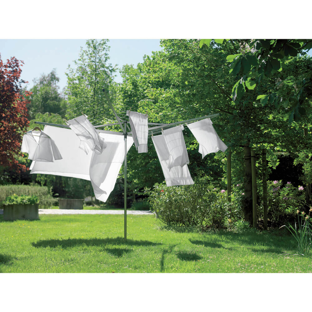 Uscator de rufe rotativ cu 4 brate + cu suport fixare pamant, Brabantia, Essential Metallic, 50 m capacitate de uscare, otel, gri