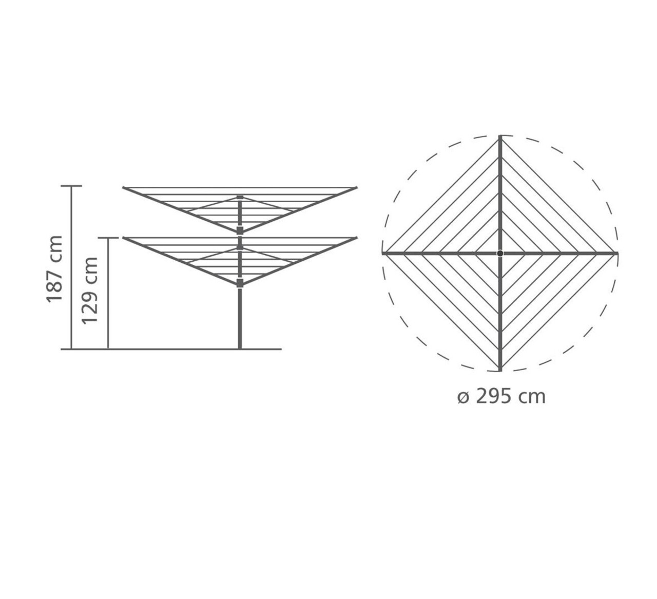 Dimensiuni uscator de rufe pliat: 11.5x11.5x199 cm. Diametru total: 295 cm.