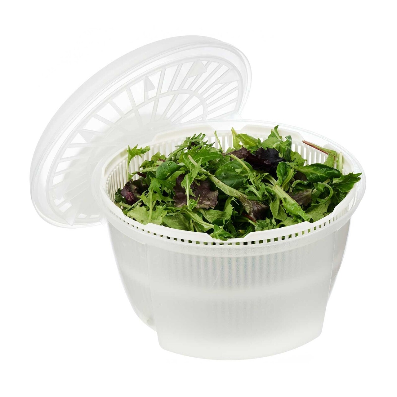 Cu ajutorul acestui uscator veti usca perfect si rapid frunzele de orice fel de salata, verdeturi si ierburi. Sistemul de functionare este bazat pe principiul de centrifuga . Manerul practic pune in miscare uscatorul, datorita caruia se scoate apa din sita interna. Poate fi folosit si pentru a servi salate pe masa dict din bol.