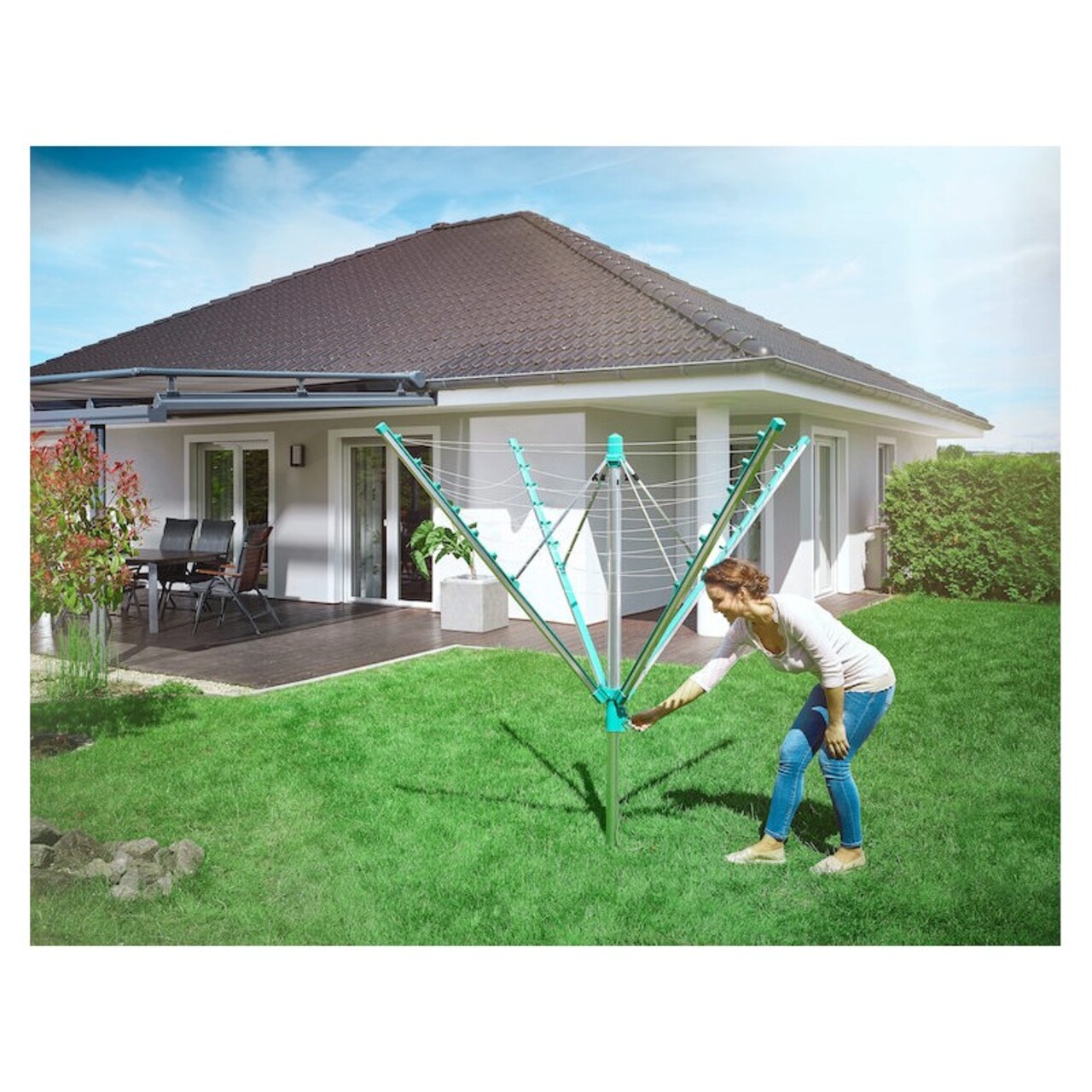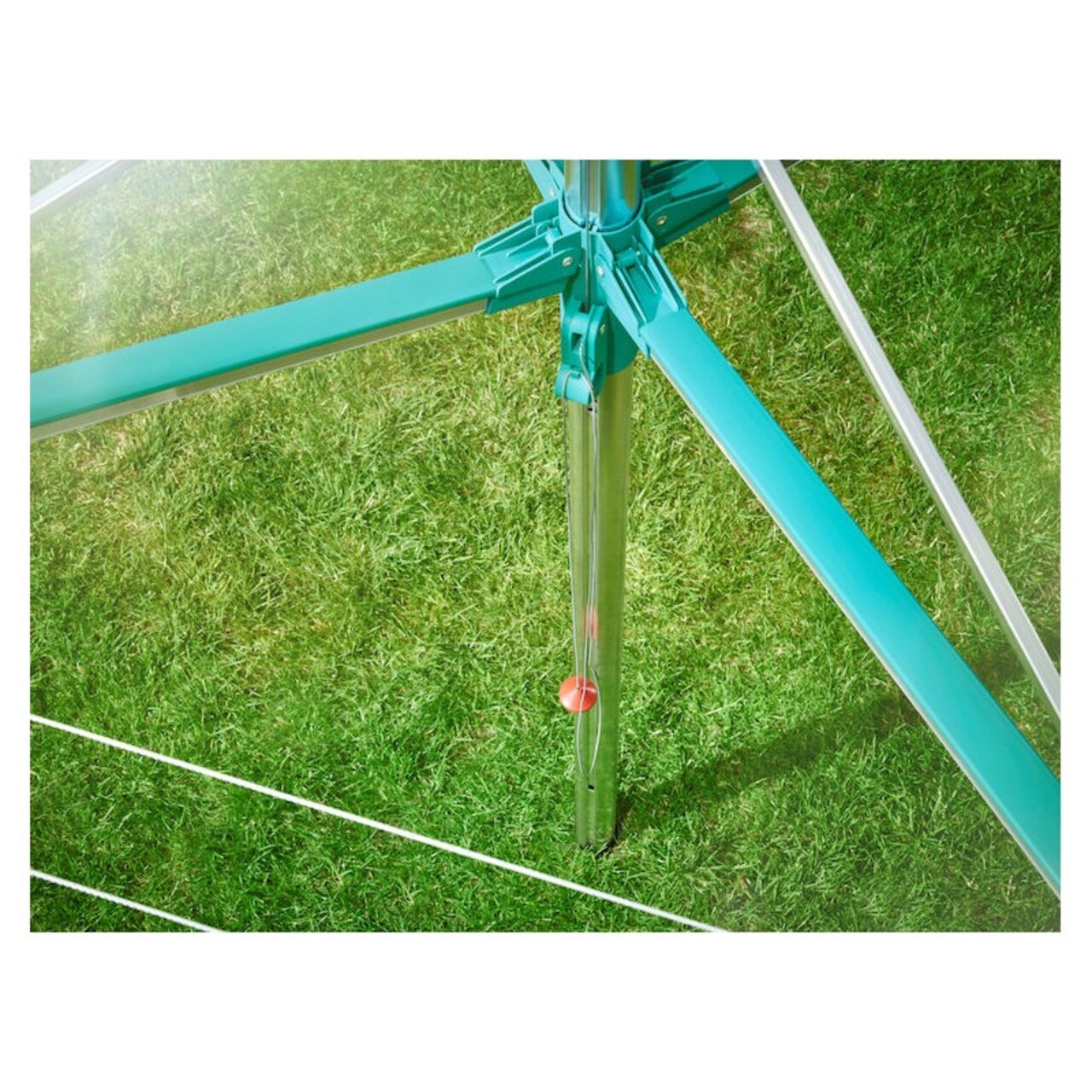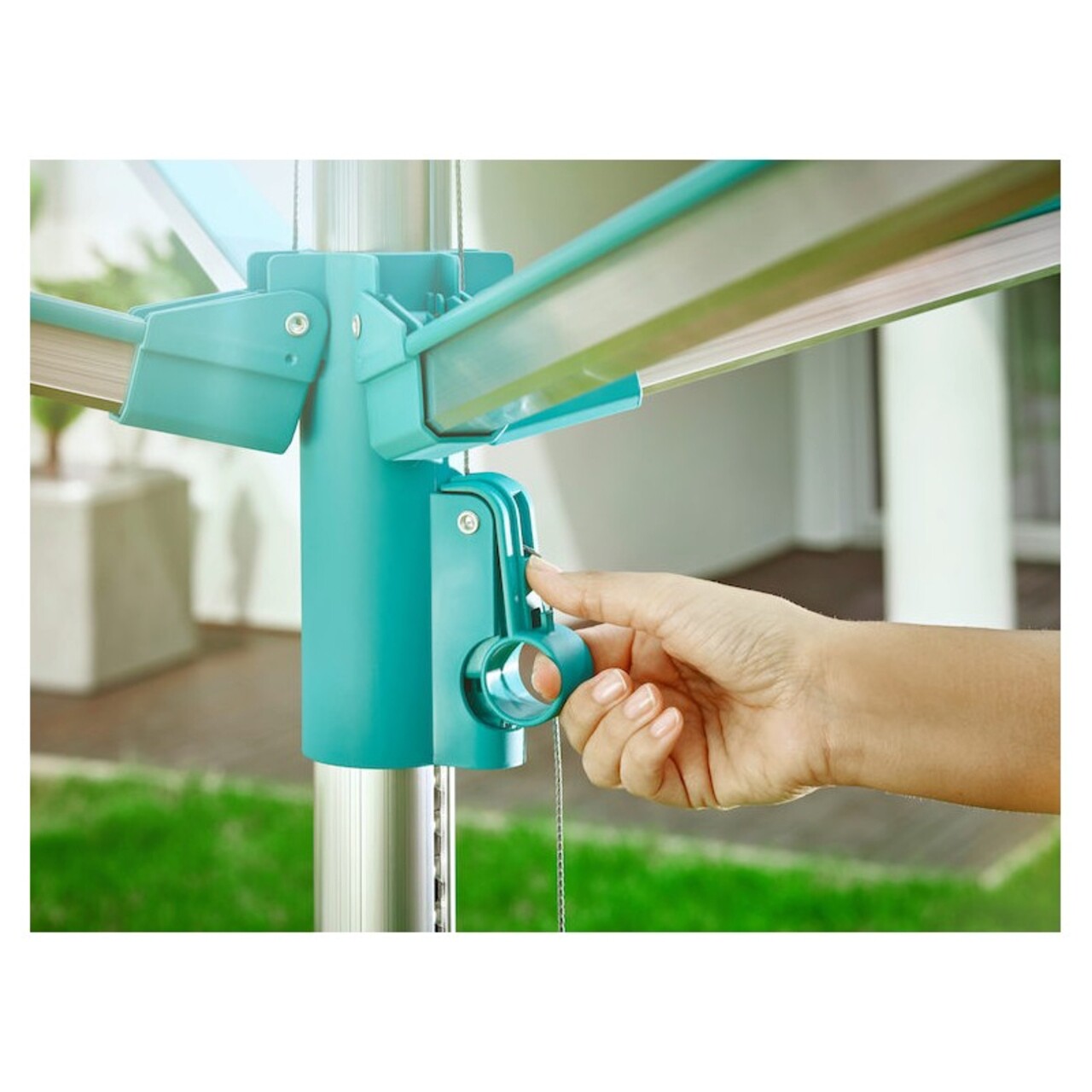 Uscatorul rotativ se inchide cu un simplu maner de eliberare pe stalpul central.