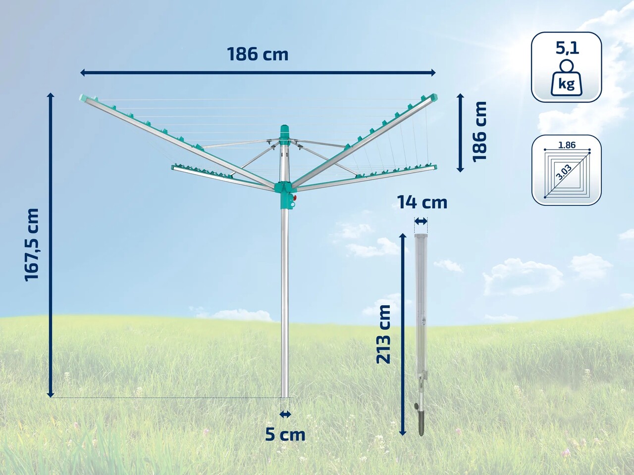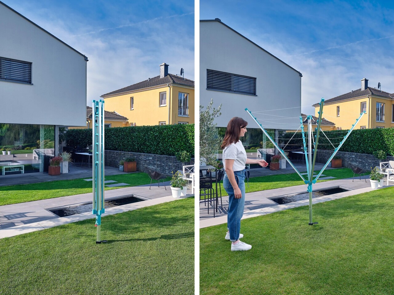 Linomatic 400 Easy se potriveste intr-o gradina mica sau pe o terasa spatioasa; este chiar suficient de lat pentru agatarea articolelor spalate, cum ar fi lenjerii de pat, fete de masa si prosoape de baie. Toate materialele folosite sunt rezistente la intemperii si UV. Linomatic 400 Easy este furnizat cu o priza de pamant pentru cimentarea prizei in beton. Accesorii disponibile: Priza de pamant cu insurubare. Facut in Germania.