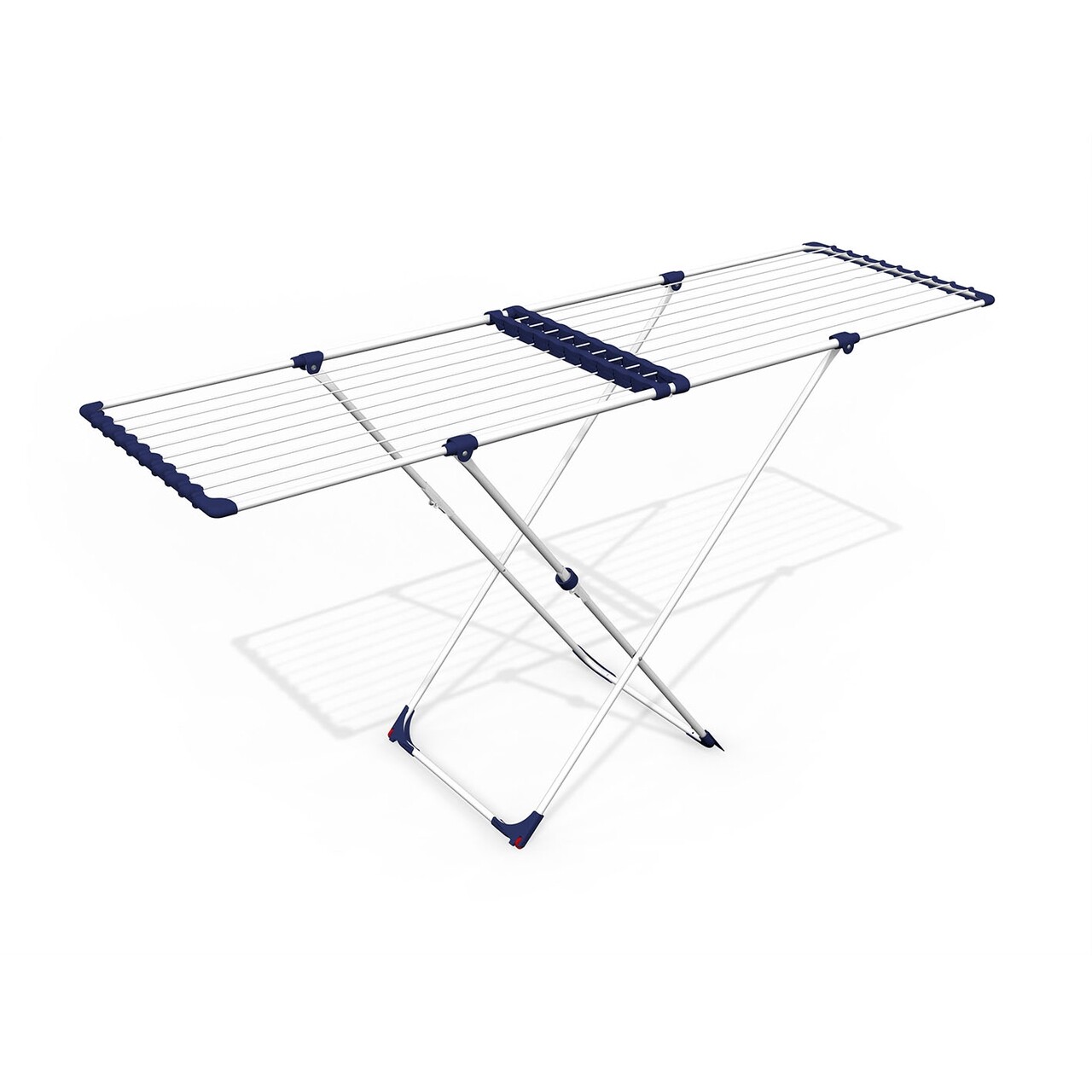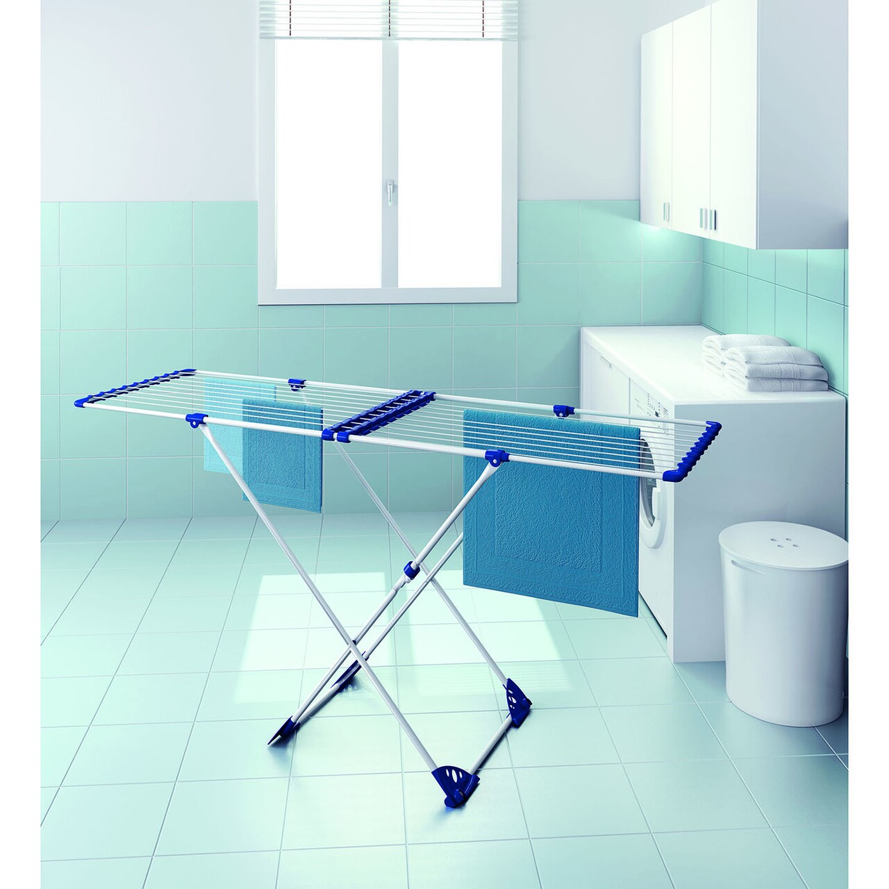 Uscatorul de rufe extensibil, cu aripi culisante, perfect pentru a fi utilizat atat in spatii inguste cat si in spatii mai generoase. Uscatorul de haine este ideal datorita firelor groase, astfel nu va crea cute si nu va sifona rufele. Acesta este prevazut pe exterior cu mici agatatori, ideale pentru uscarea rufelor de mici dimensiuni, roti, un sistem de siguranta pentru a evita inchiderea accidentala si protectie din plastic pe laterale si la colturi, pentru a evita deteriorarea parchetului. Capacitatea de uscare este de 20 m. Greutatea maxima de incarcare recomandata este de 20 kg.
