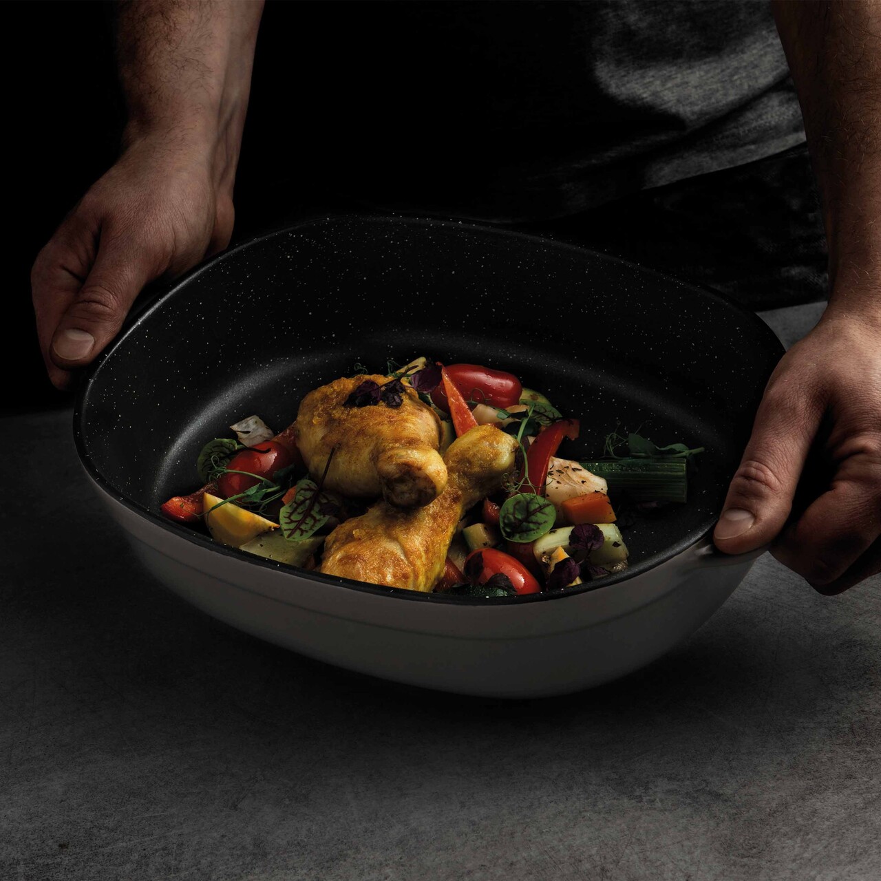 Un preparat clasic de cartofi gratinati, o tocana de iarna reconfortanta sau o budinca de capsuni, toate sunt la fel de bune atunci cand le coaceti in acest vas oval! Echipat cu manere late pentru o prindere usoara si un strat de email care asigura o dezlipire usoara a alimentelor si o curatare fara efort, acest vas din ceramica neagra este suficient de elegant pentru a merge din cuptor direct pe masa si suficient de durabil pentru a dura multi ani.