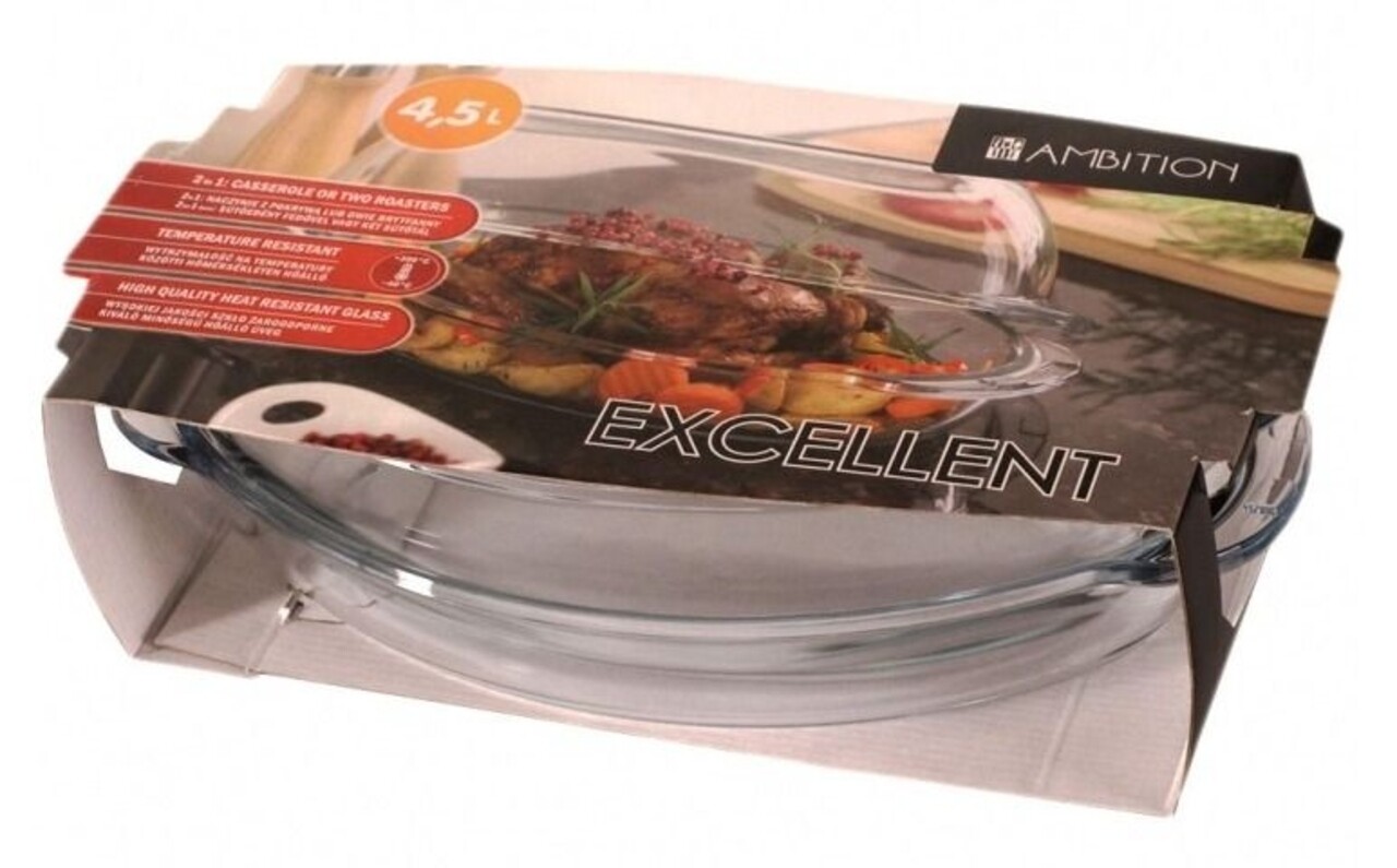 Caserola din sticla termorezistenta, cu o capacitate de 4500 ml. Vasul termorezistent cu capac este destinat gatirii in orige tip de aragaz, ca de asemenea pentru utilizarea la cuptorul cu microunde sau depozitarea alimentelor in frigider sau congelator. Aceasta rezista la temperaturi cuprinse intre -40 si +300 grade C, si poate fi folosita fie care un vas cu capac, fie ca doua vase separate. Prima piesa are o capacitate de 1700 ml, iar cea de-a doua de 2800 ml. Se poate curata cu usurinta in masina de spalat vase.