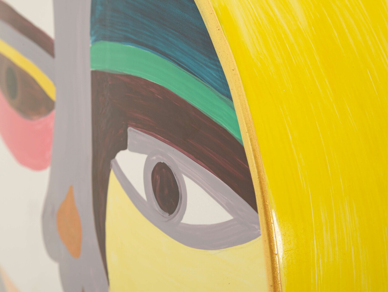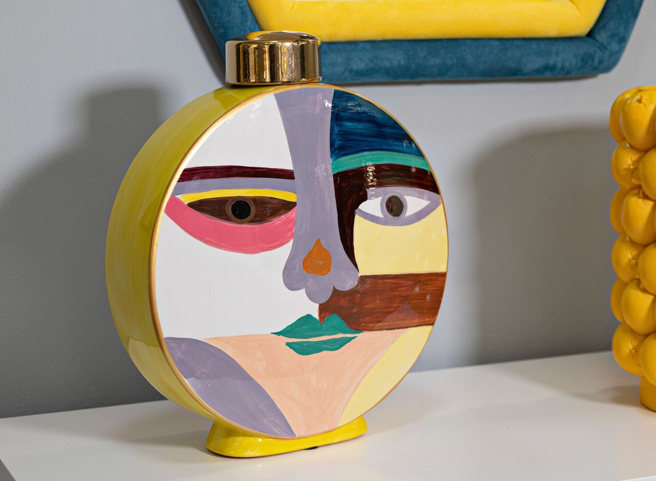 Aceasta vas rotund imbina formele fluide cu culorile vii si detalii grafice inspirate din arta cubista. Un obiect decorativ original si rafinat, perfect pentru cei care prefera un stil creativ si nonconformist. Diametru orificiu: 5 cm.