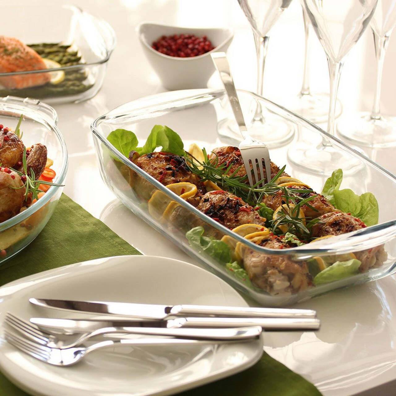 Caserola dreptunghiulara din sticla termorezistenta. Ideala pentru a gati sau incalzi mancarea la toate tipurile de cuptoare, inclusiv la cuptorul cu microunde, dar si pentru a pastra si depozita mancarea la congelator. Vasul rezista la temperaturi intre -40 si +300 grade C. Nu in ultimul rand, aceasta se poate spala cu usurinta in masina de spalat vase.