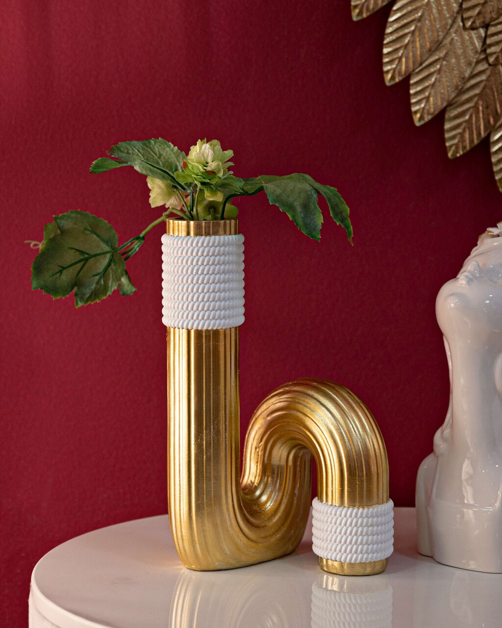 Vaza eleganta din polirasina aurie, cu finisaje albe si linii sinuoase. O combinatie rafinata intre modern si organic.