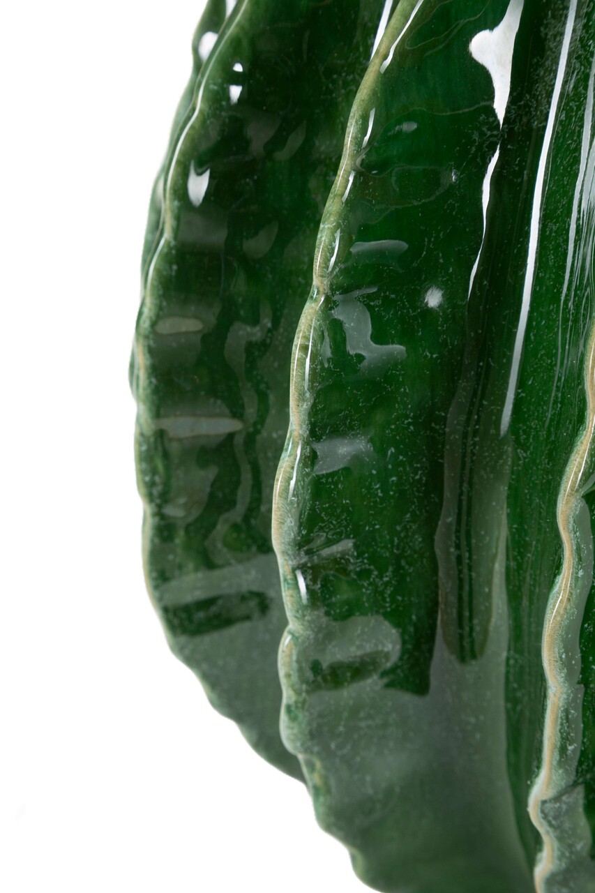 O piesa decorativa de mici dimensiuni, dar cu impact vizual remarcabil. Forma sferica, textura lucrata si finisajul verde intens o recomanda pentru decoruri cu un aer proaspat si modern. Diametru orificiu: 7.5 cm.