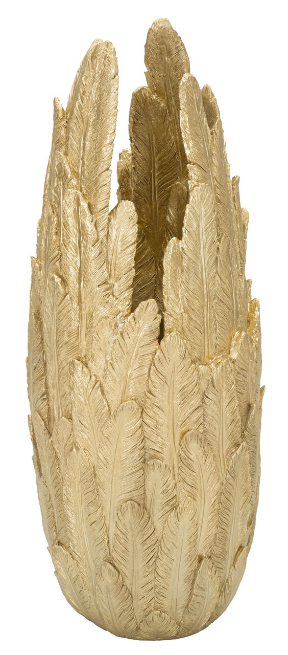 Vaza decorativa din polirasina, cu finisaj auriu si design compus din pene stilizate. Adauga o nota calda si eleganta oricarei incaperi. Deschidere superioara: Ø 21 cm
