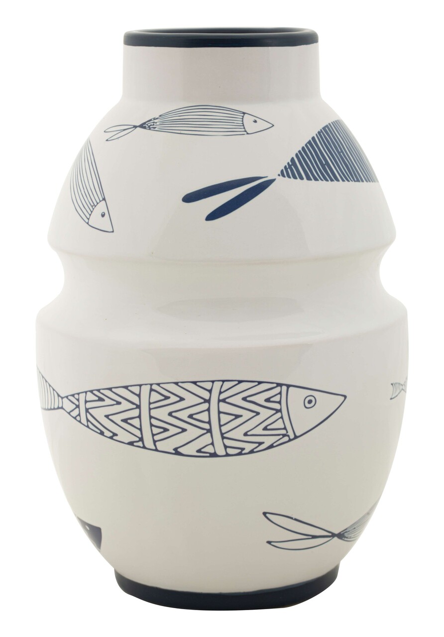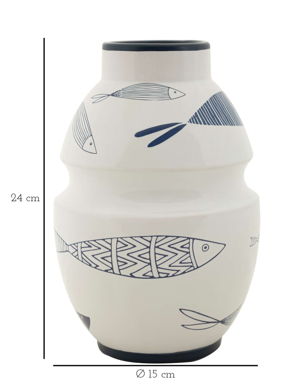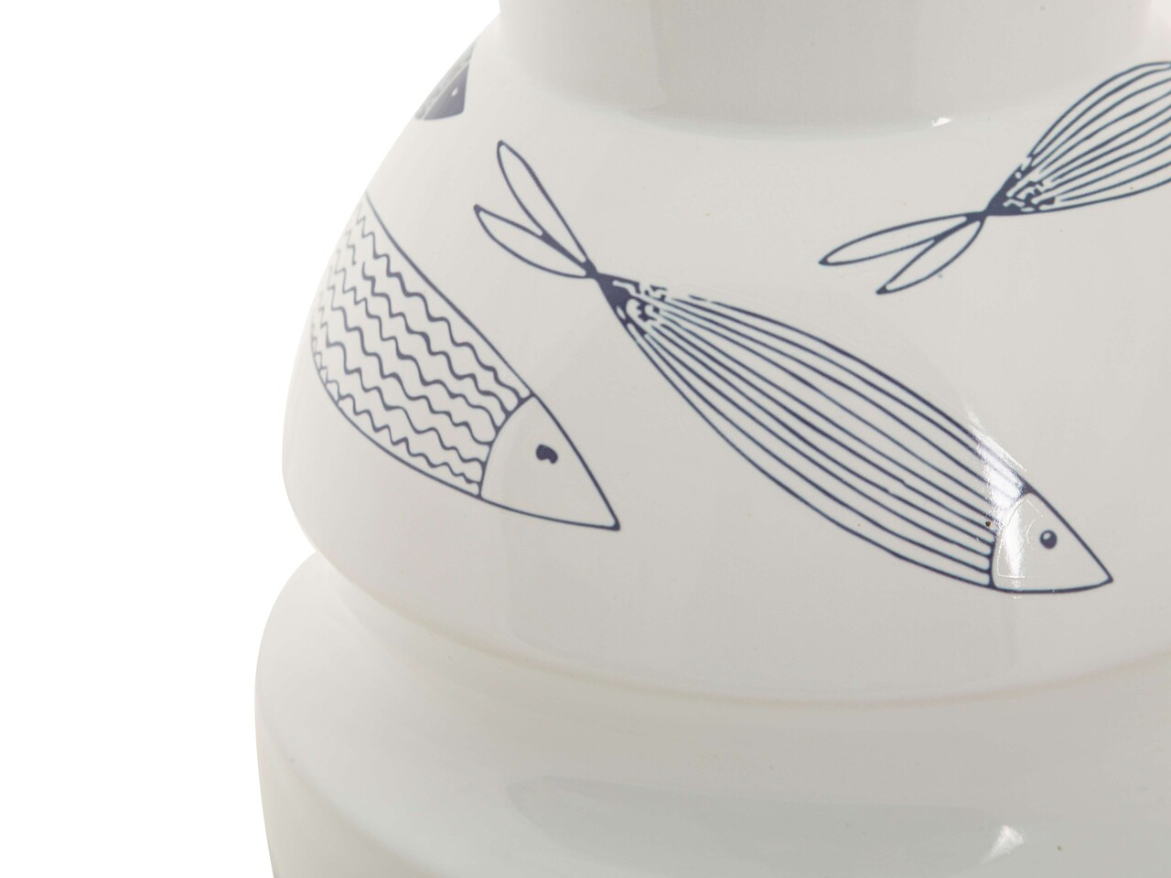 Vaza din ceramica alba, cu decoratiuni albastre si motiv cu pesti. Designul creeaza o atmosfera marina, relaxanta si plina de prospetime. Deschidere superioara: Ø 6 cm