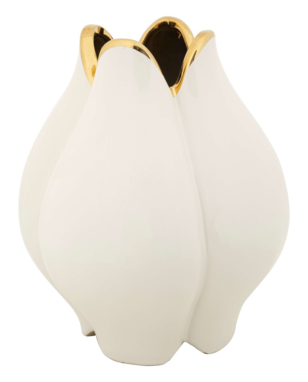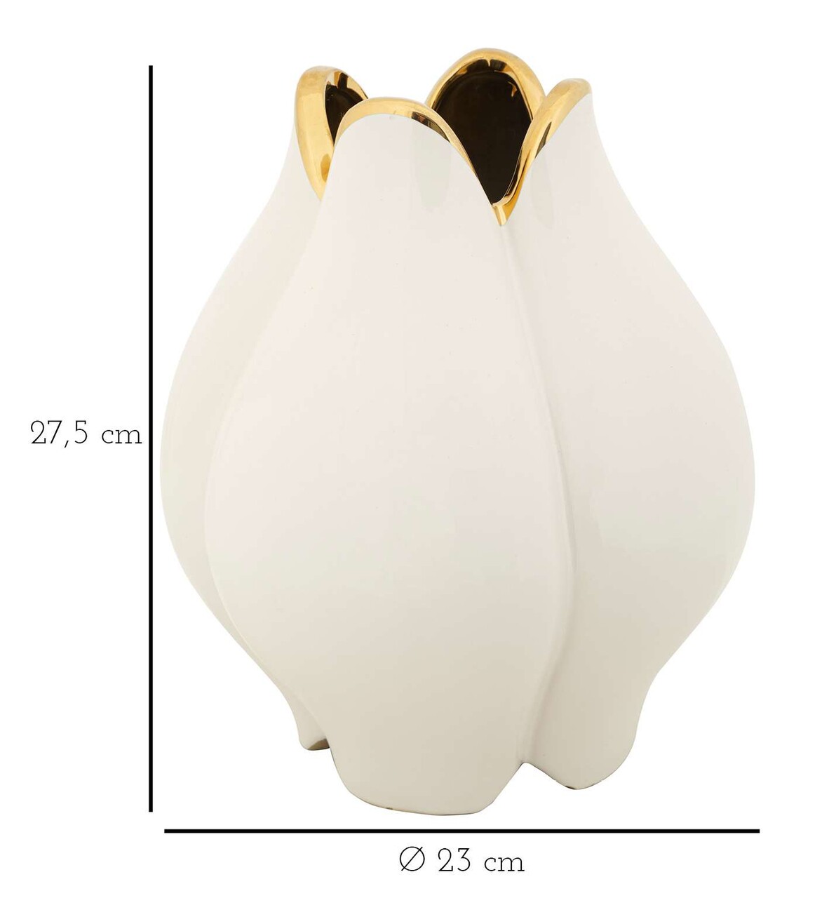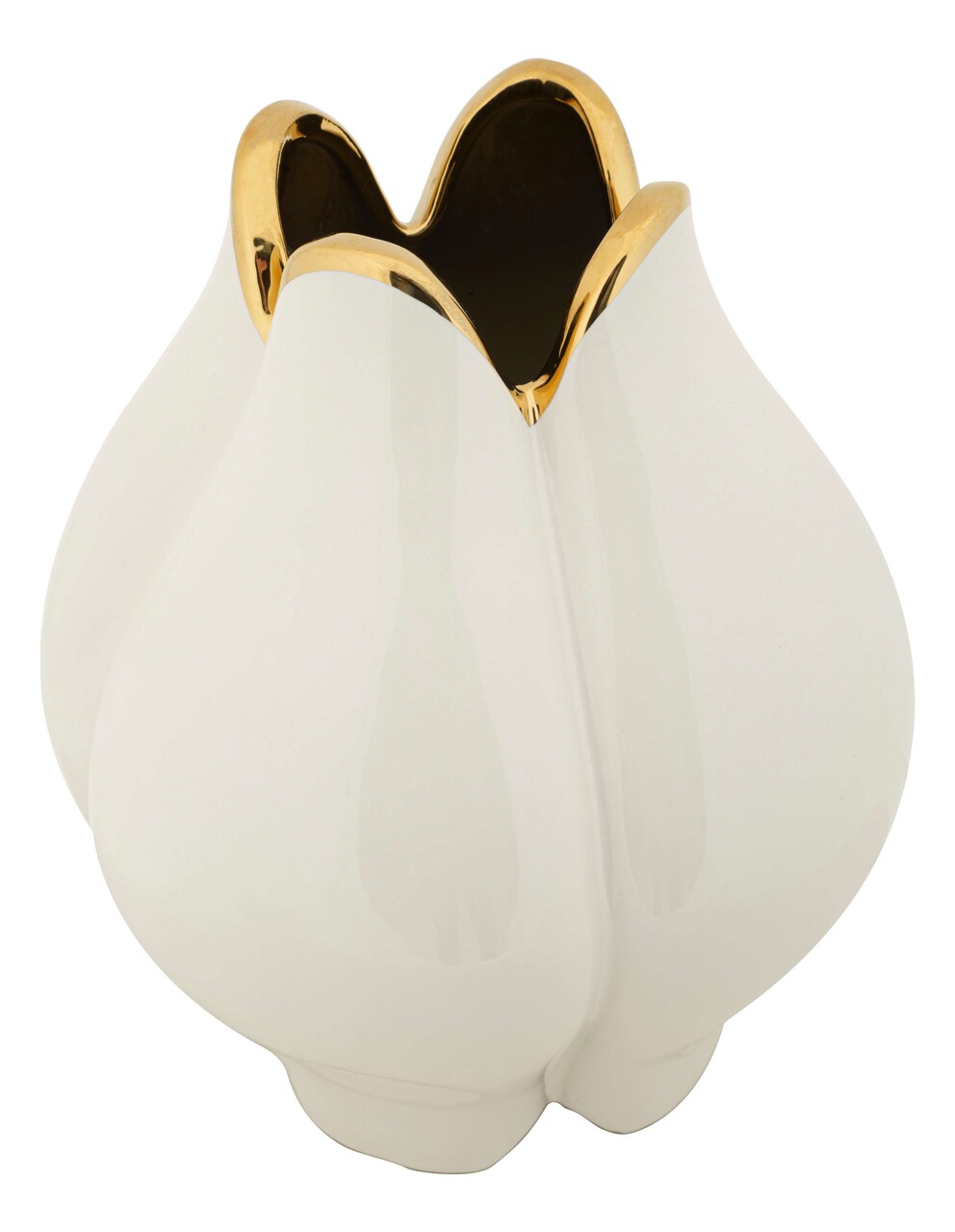 Vaza decorativa din ceramica alba, cu finisaje aurii elegante si un design inspirat de forma unui boboc de floare. Un accent fin si rafinat pentru orice incapere.