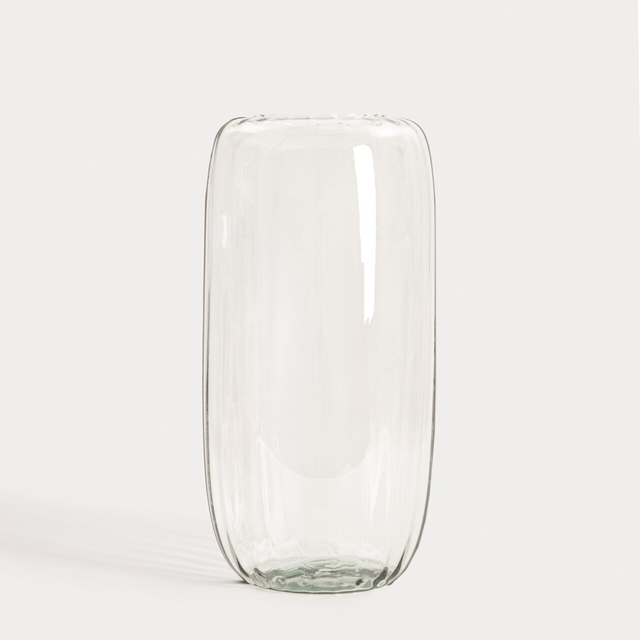 Produsul este fabricat din sticla reciclata care este durabila si estetica. Suprafata transparenta permite expunerea completa a continutului vazei. Se recomanda spalarea manuala.